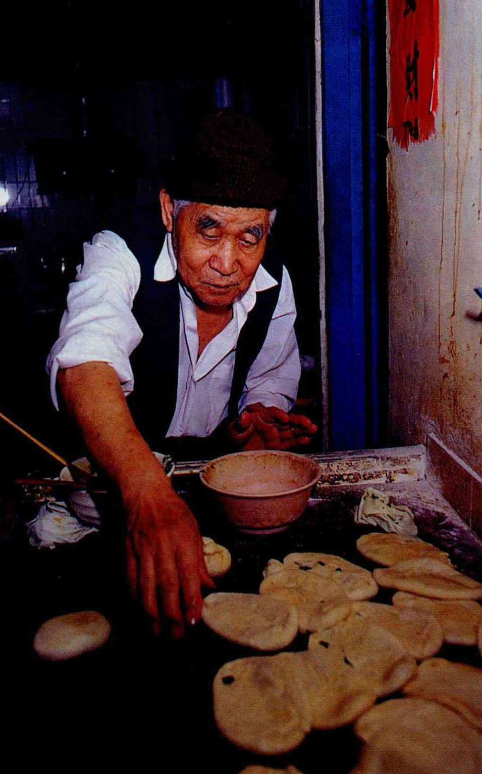 This trio of products was once the monopoly of people from Shandong Province, but because they are easy to make-all that is required is the willingness to get up in the middle of the night to crush soybeans and bake the shaobing-many NCOs learned to make them from army cooks or their fellow officers, and on leaving the forces opened a shaobing shop to earn a living. In the early days they paid little attention to decor-in fact the more ramshackle the premises, the less they cost. Before they had electric ovens, they would bake the shaobing in makeshift furnaces made from a large earthenware water pot set inside an oil drum with the top cut off. They would light a charcoal fire inside the pot, and when the coals were glowing and the pot was hot they would stick the shaobing against the inside of the pot to bake.