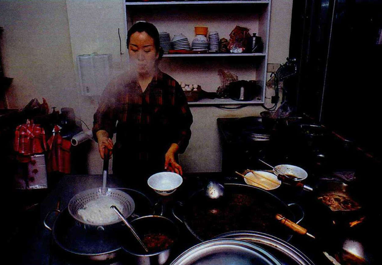 "At first they sold jiaozi [ boiled filled dumplings ] and baozi [steamed stuffed buns]," recalls Li Yun-mei. "It took a lot of work, all by hand. First you had to mix the filling, make the dough and let it rise, and roll the skins. Then you had to take the skins in the palm of your hand one by one, fill them and pinch them shut. We worked till two or three o'clock every morning, but we still only made three or four thousand jiaozi. When we opened up at lunchtime the next day these would sell out in no time, and we were too busy to make any more. Later, we switched to things that were less work, such as hand-stretched noodles, with which we made thick noodle soup, fried noodles and so on." Even so, says Li, it was hard to keep up with all the work. Her father died three years ago, and today she runs the cafe with her two sisters. As the one in charge, she has to work 16 hours a day on average, and when her daughter comes home from junior high school each day she too has to help by making gherkin salad.
