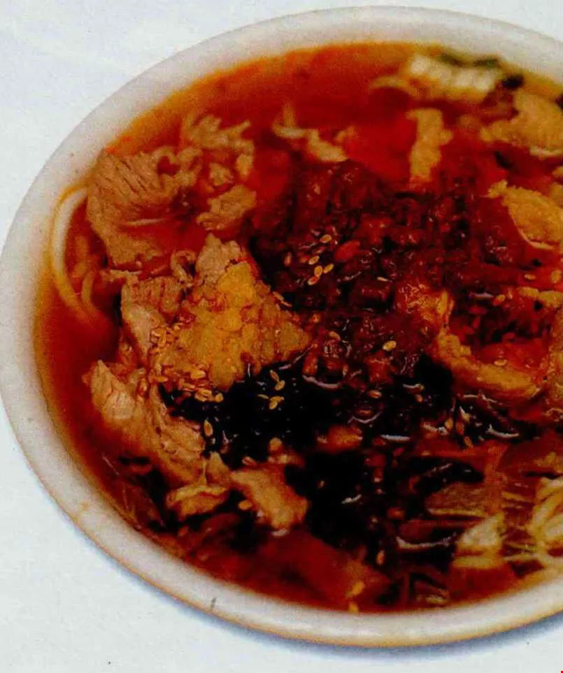 "Sichuanese" beef noodle soup is a case in point. Lu Yao-tung, who is very partial to this dish, once checked this out. In Taiwan the most popular style of beef noodle soup is Sichuanese, so on a trip to Chengdu, Sichuan's provincial capital, Lu went out in search of authentic Sichuanese beef noodle soup. But after tramping the city's streets and alleyways for a full two hours, he drew a complete blank-there was no sign of such a dish. He merely discovered that snack foods in Sichuan include small bowls of beef soup, and he surmised that when Sichuanese came to Taiwan years ago they brought with them the recipe for beef soup; later, someone had the idea of adding noodles. If this is so, beef noodle soup may be a purely Taiwanese invention.