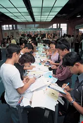 A young Mr. Lin stops at the Compal booth and inquires about the requirements for a process engineer. Lin holds a degree in mechanical engineering from Da-Yeh University, and has recently completed his compulsory two-year stint in the military. He retrieves a resume from his backpack, hands it to the person manning the booth, and asks whether he'll be able to have an interview. In the meantime, business management graduate Ms. Li has been once around the exhibit hall and mumbles to herself, "I don't think there's anything quite right for me." Big crowds of job seekers throng to the booth of the National Youth Commission (NYC), where they register their personal information on the NYC website.