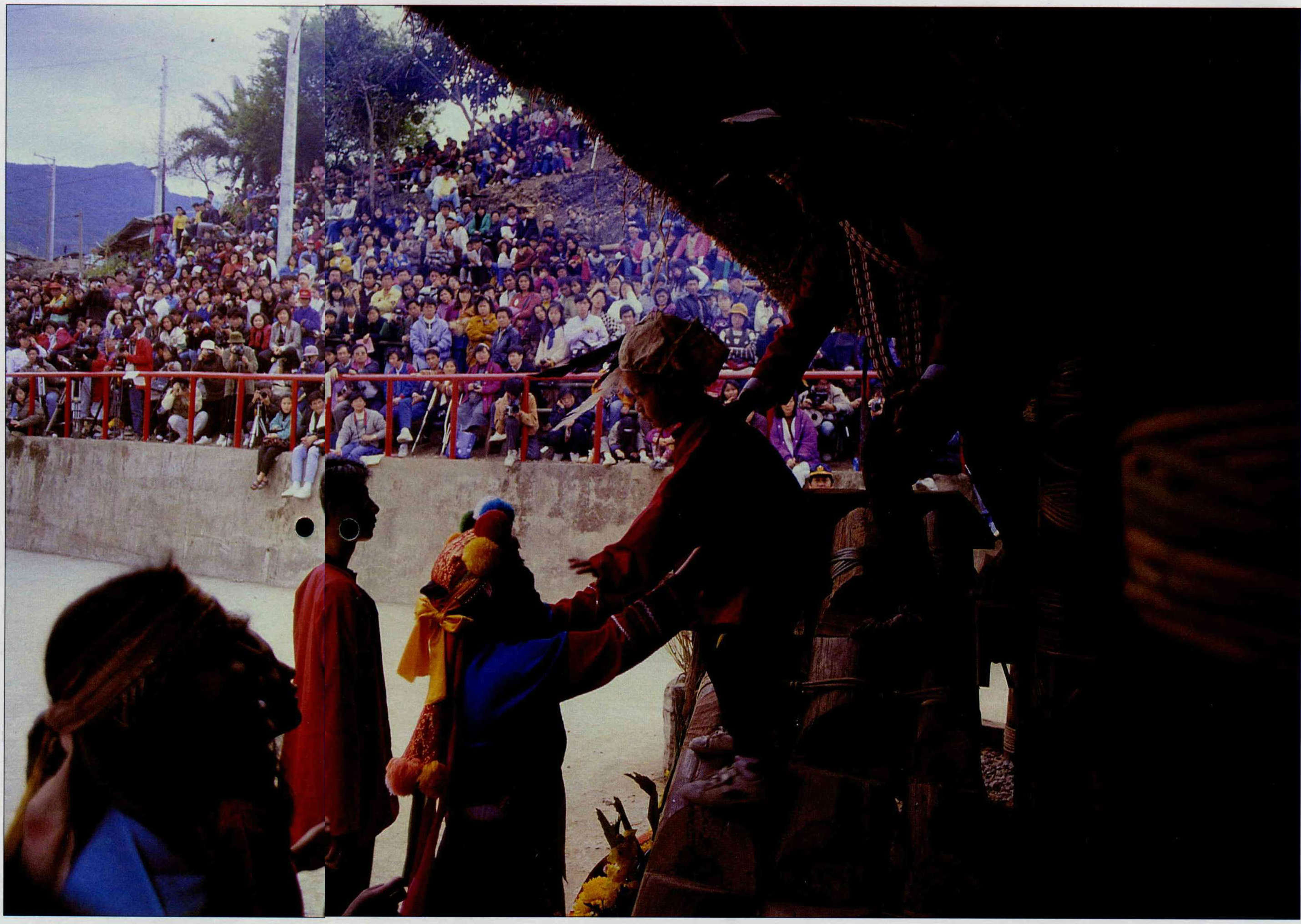 (Right) During the tribal initiation rites for Tsao youngsters, mothers pass their children to the village elders, symbolizing that Tsao culture will eternally be passed along.