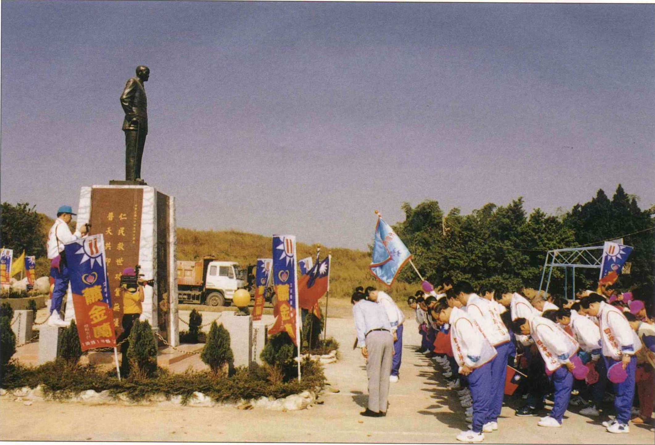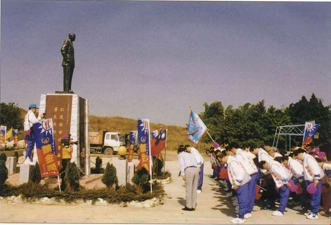 A group of more than 80 KMT campaign workers from overseas provided welcome support in last year's legislative elections. The photo shows them paying their respects before a statue of Chiang Kai-shek. (photo courtesy of the KMT Department of Overseas Affairs)