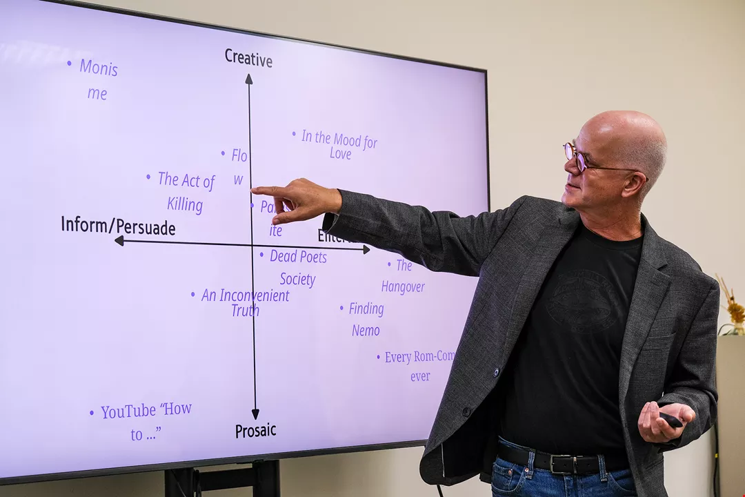 US-born Sean Chadwell, executive director of the Blue Chair Film Festival in Laos, speaks about types of cinematic narration at a workshop entitled Confluences: Art, Science, and Storytelling along the Mekong.