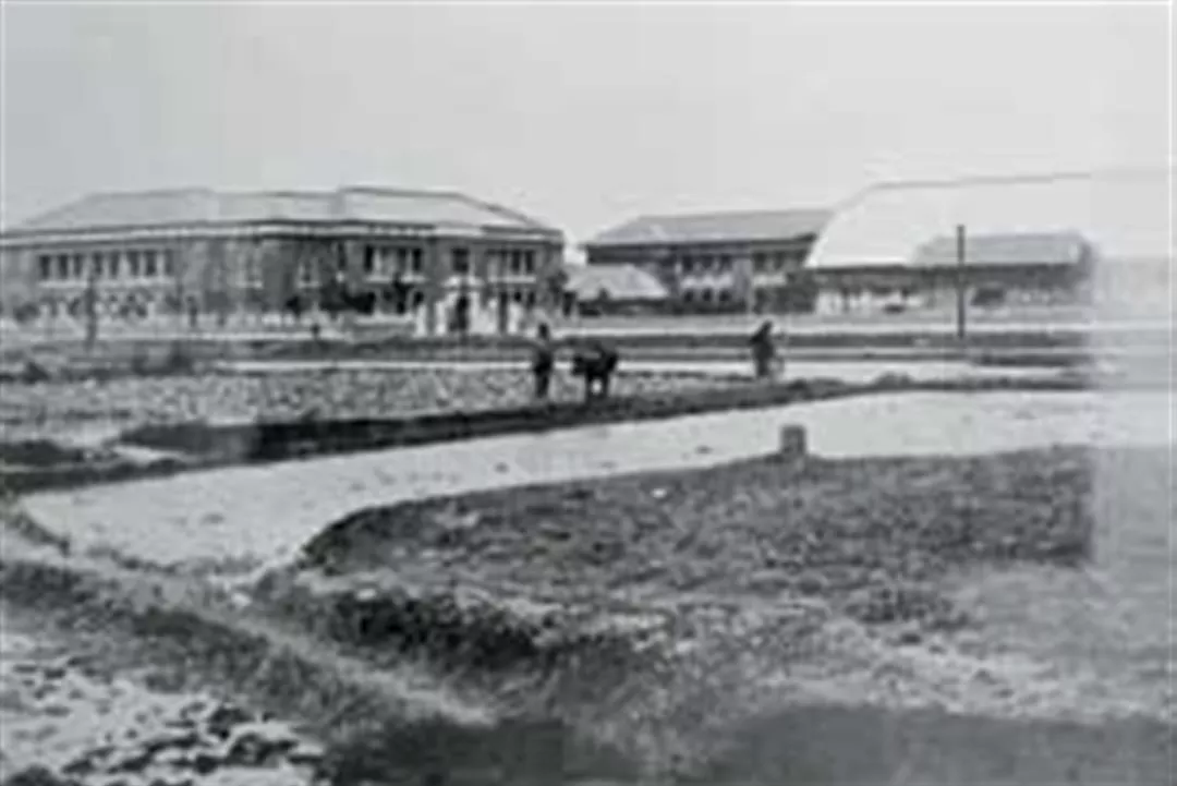 Taihoku Imperial University had expansive grounds. Showing the law school at Hsuchou Road, this photo-graph provides a glimpse of the Taipei Basin before development.