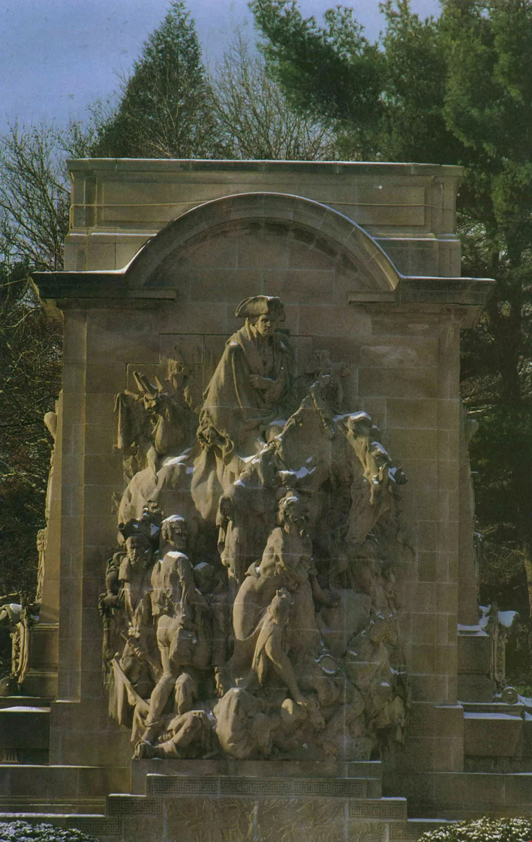 The heroic spirit of General Washington in defeating the British troops at the Battle of Princeton is vividly preserved in this war memorial.