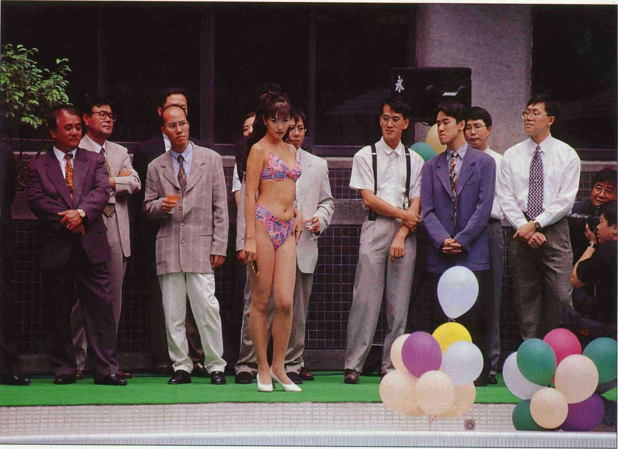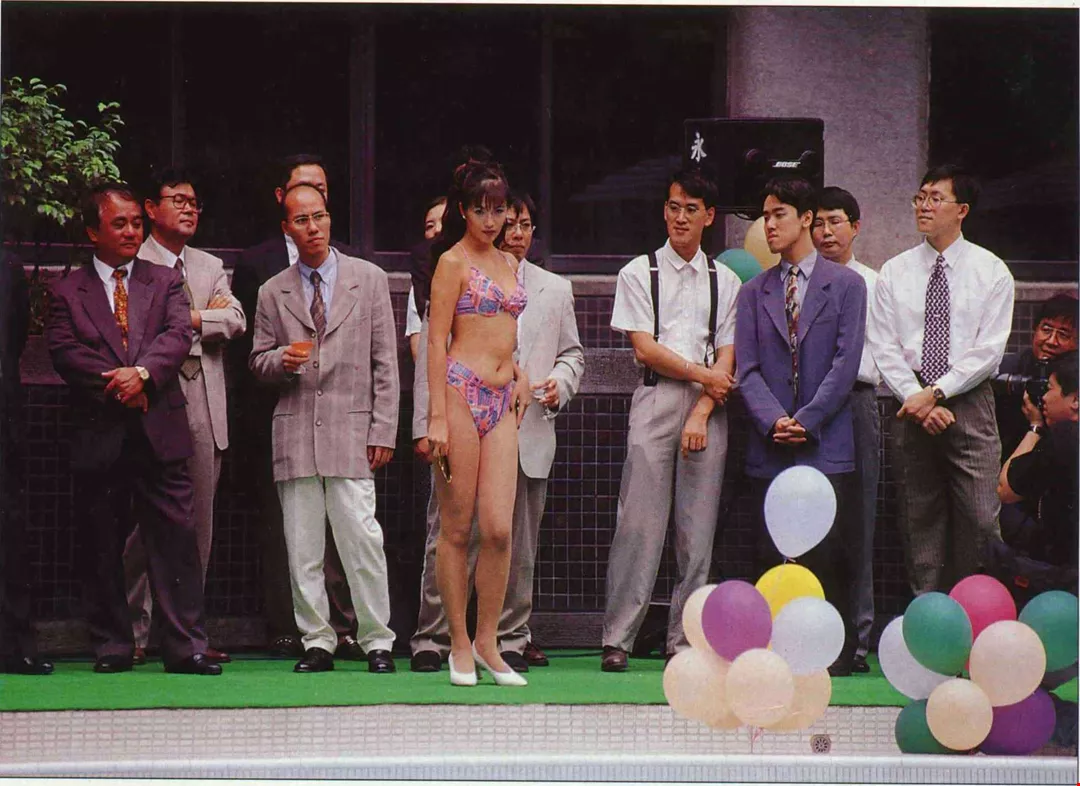 In front of a beautiful girl, the guys try to look serious, but their eyes cannot conceal their "secret." The photo was taken at a press conference marking the first issue of the Taiwan edition of Playboy. (photo by Diago Chiu)