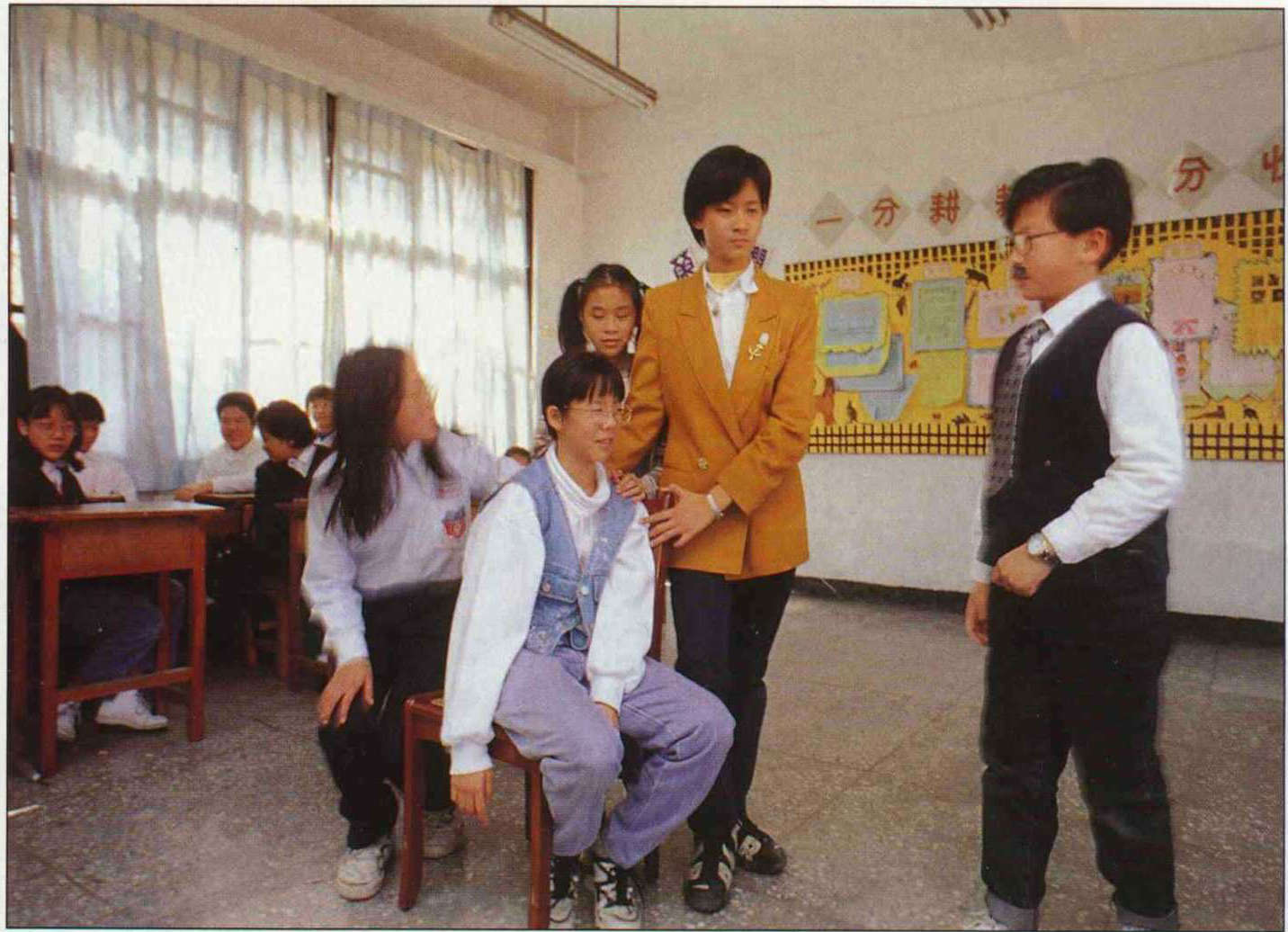 "When the older guy next door tries to harass her, the little girl is smart and runs away from the evil wolf!" Through role-playing, children are taught to protect themselves from harm. The photo shows a class at the Wuchang Primary School in Taipei.