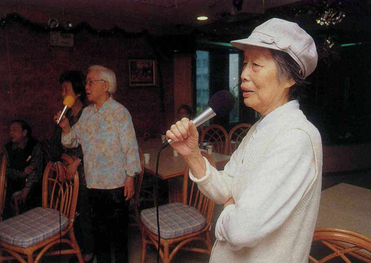 We just happened to arrive at the time of one of the center's twice weekly karaoke sessions; seven or eight grandmothers and grandfathers were in the recreation room following along with the words on the TV screen. Some were holding microphones, singing and dancing, while others were clapping in time to the rhythm. All were enjoying themselves. Not only did they not feel the least bit embarrassed by the arrival of unexpected visitors, they enthusiastically welcomed us, inviting us to join them.