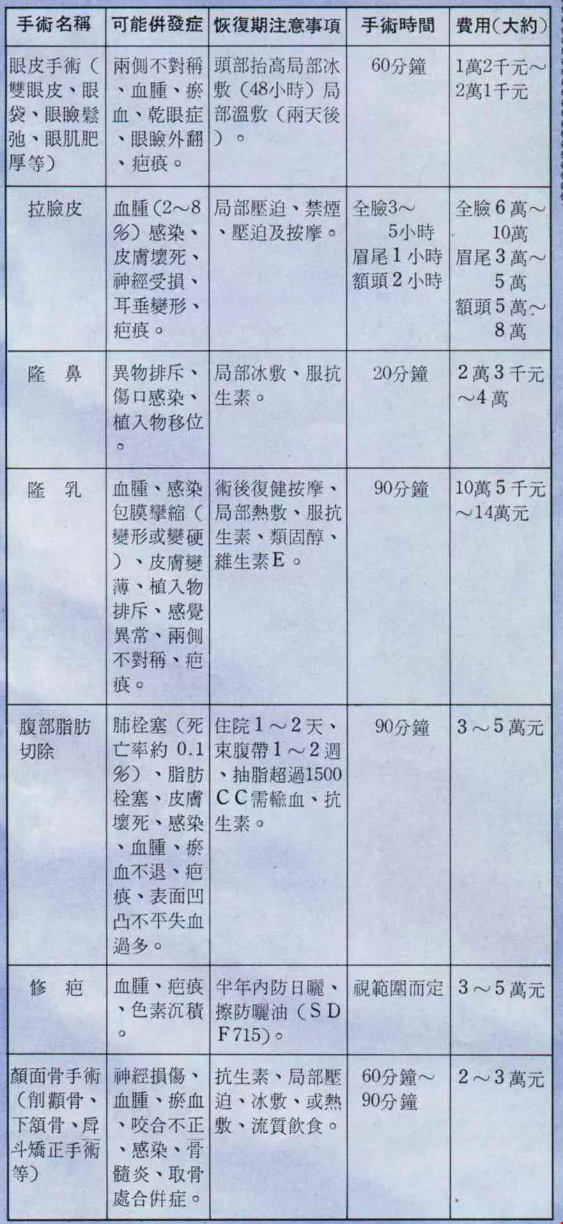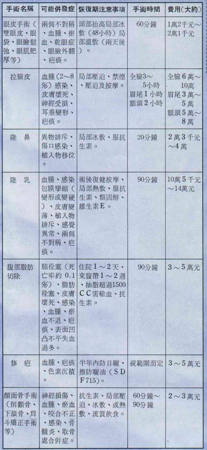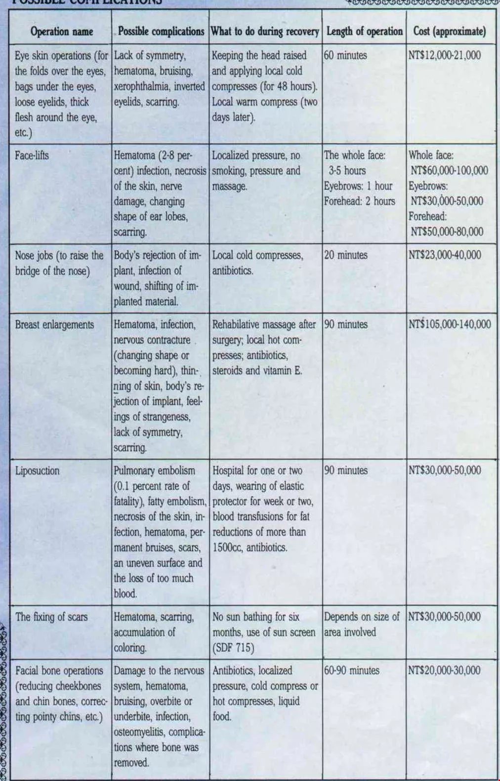 COMMON COSMETIC SURGERY AND POSSIBLE COMPLICATIONS [Picture]