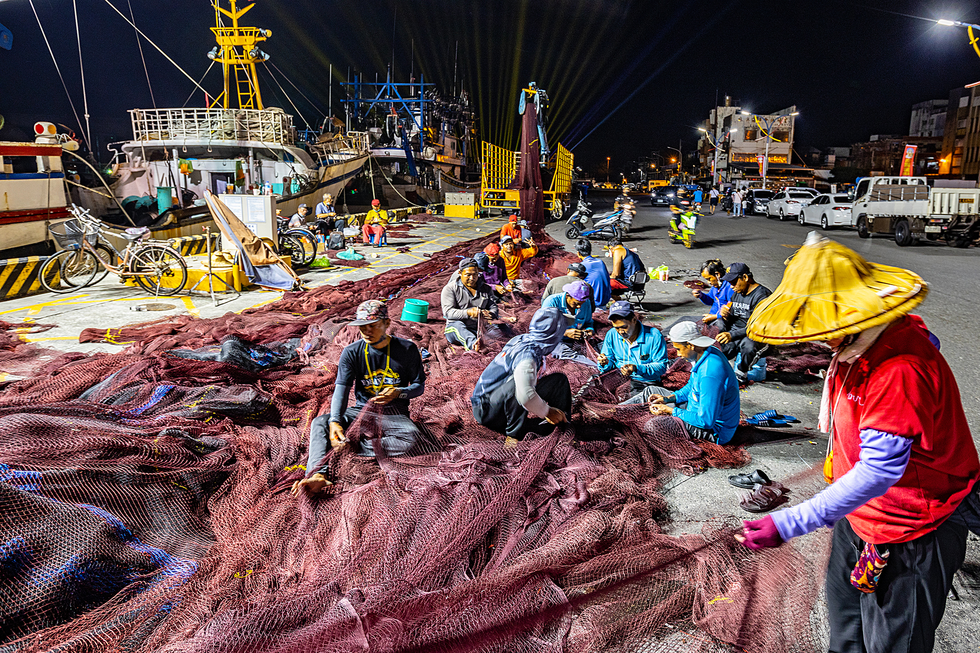 Nanfang’ao Fishing Harbor in Yilan County is one of Taiwan’s three largest fishing harbors. Whenever fishing vessels return to port, damaged nets must be repaired, a labor-intensive task that carries on day and night.