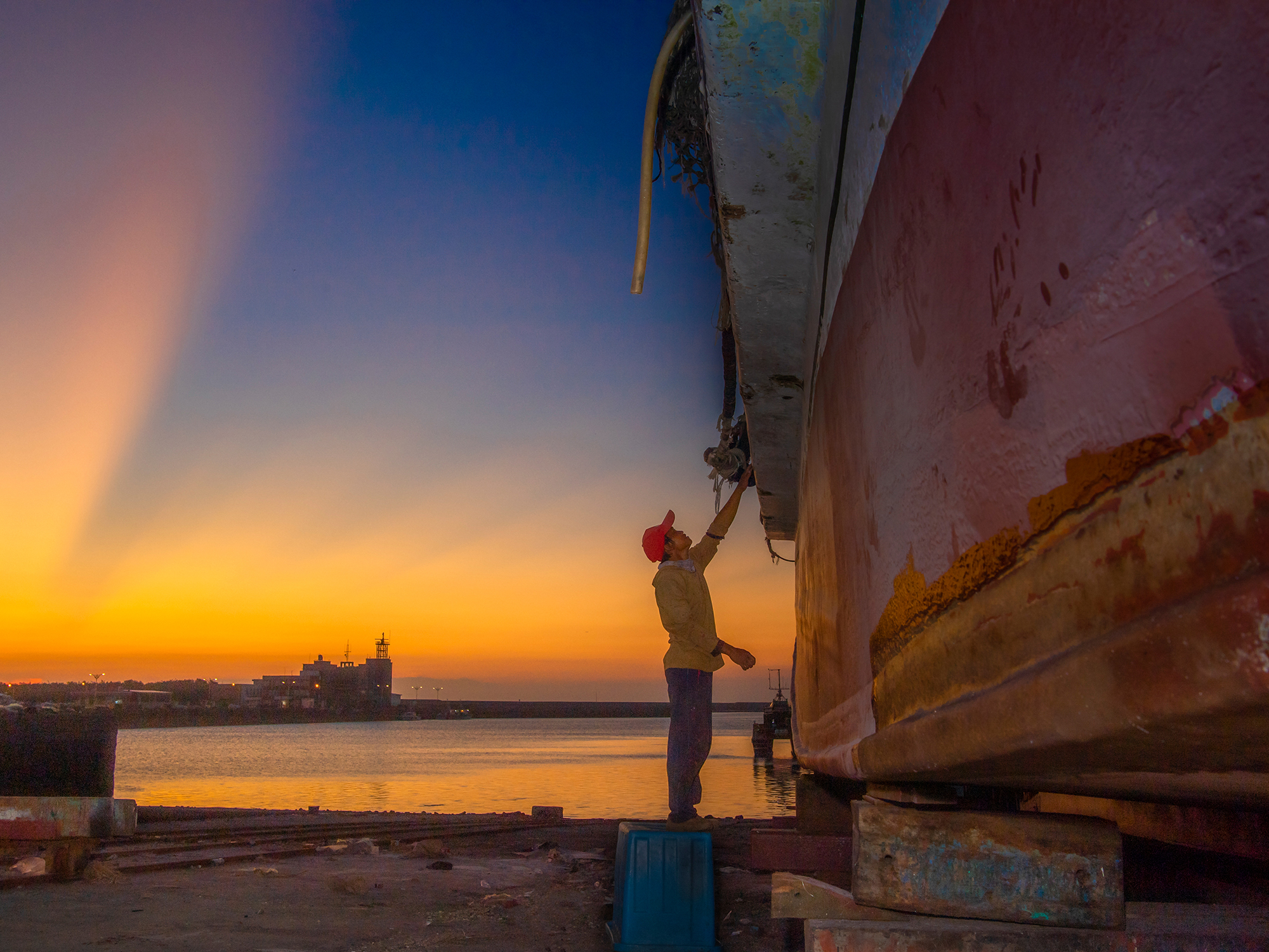 With the arrival of the main fishing season, fishing vessels come into port to make ready for going to sea. The boats take on additional fishing gear and do the necessary preparations and checks prior to setting out. In this photo, a crew member is painting the hull of a fishing vessel at sunset.