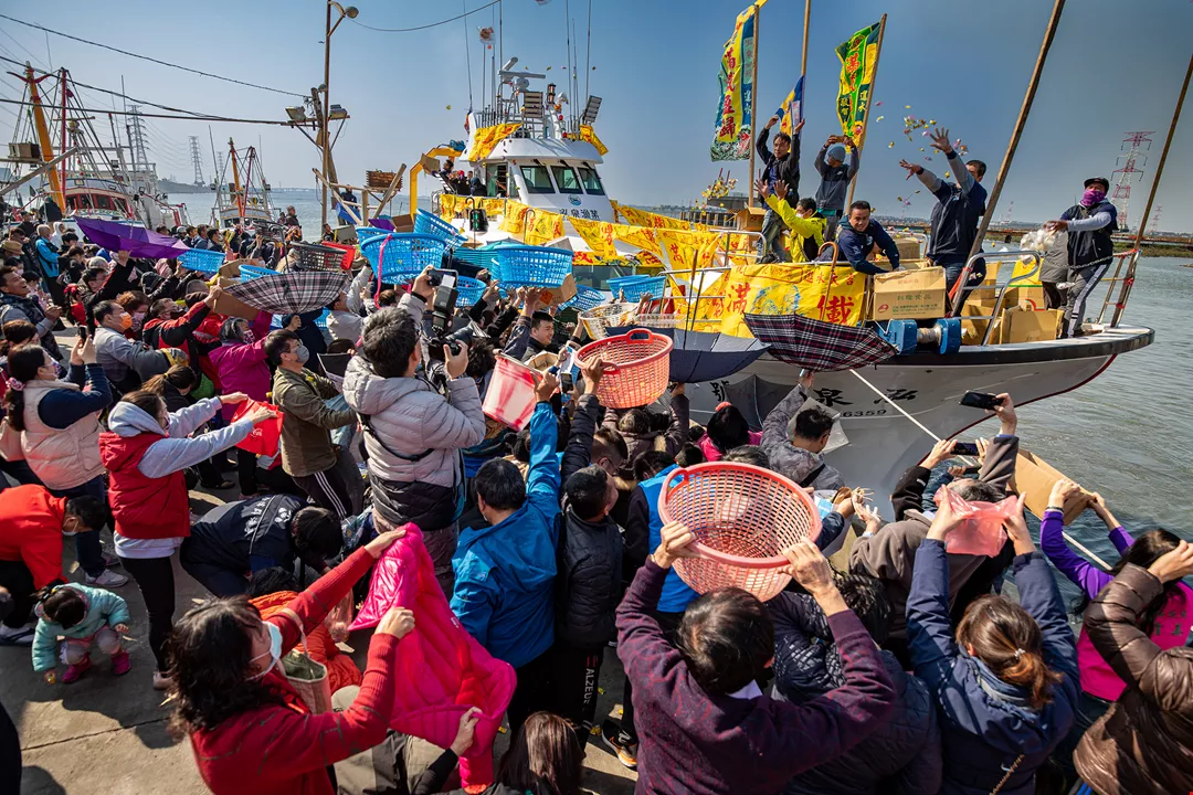At Wenzi Fishing Harbor in Changhua County’s Xianxi Township, after a new fishing vessel is launched a ceremony called zhiji (“casting auspiciousness”) is held in which the new boat is led into port by older boats, and after the new boat ties up at the harborside, the crew throws a full ton of foods such as mochi rice cakes, candy, and steamed buns from the boat while people on shore vie to catch these treats. The event symbolizes abundant catches for the new vessel. Part of the Taiwanese Hokkien word for mochi sounds like the word for “auspicious,” meaning that those who catch the mochi or candy will enjoy happiness and good fortune.