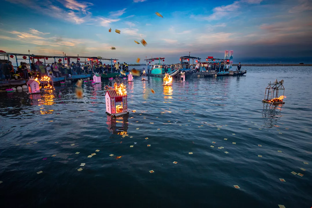 The annual Qianshuizhuang ceremony in Yunlin County’s Kouhu Township, commemorating the deadly floods of 1845, is designated as intangible cultural heritage of national importance. As part of the event, water lanterns are released at Jinhu Fishing Harbor. People put to sea on pipe rafts to experience the mysterious atmosphere of the water lanterns up close. The eye-catching lanterns floating on the pitch-black seawater look like small lighthouses.