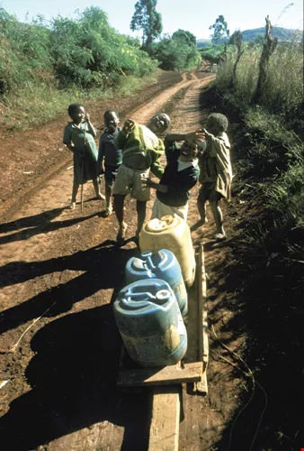 In the high plains of eastern Africa, sinking wells is no easy matter and wells are not necessarily located in villages. Roundtrips of an hour are common for residents carrying water back to villages. The women, who are responsible for carrying the water, are skilled at carrying containers full of water on their head.