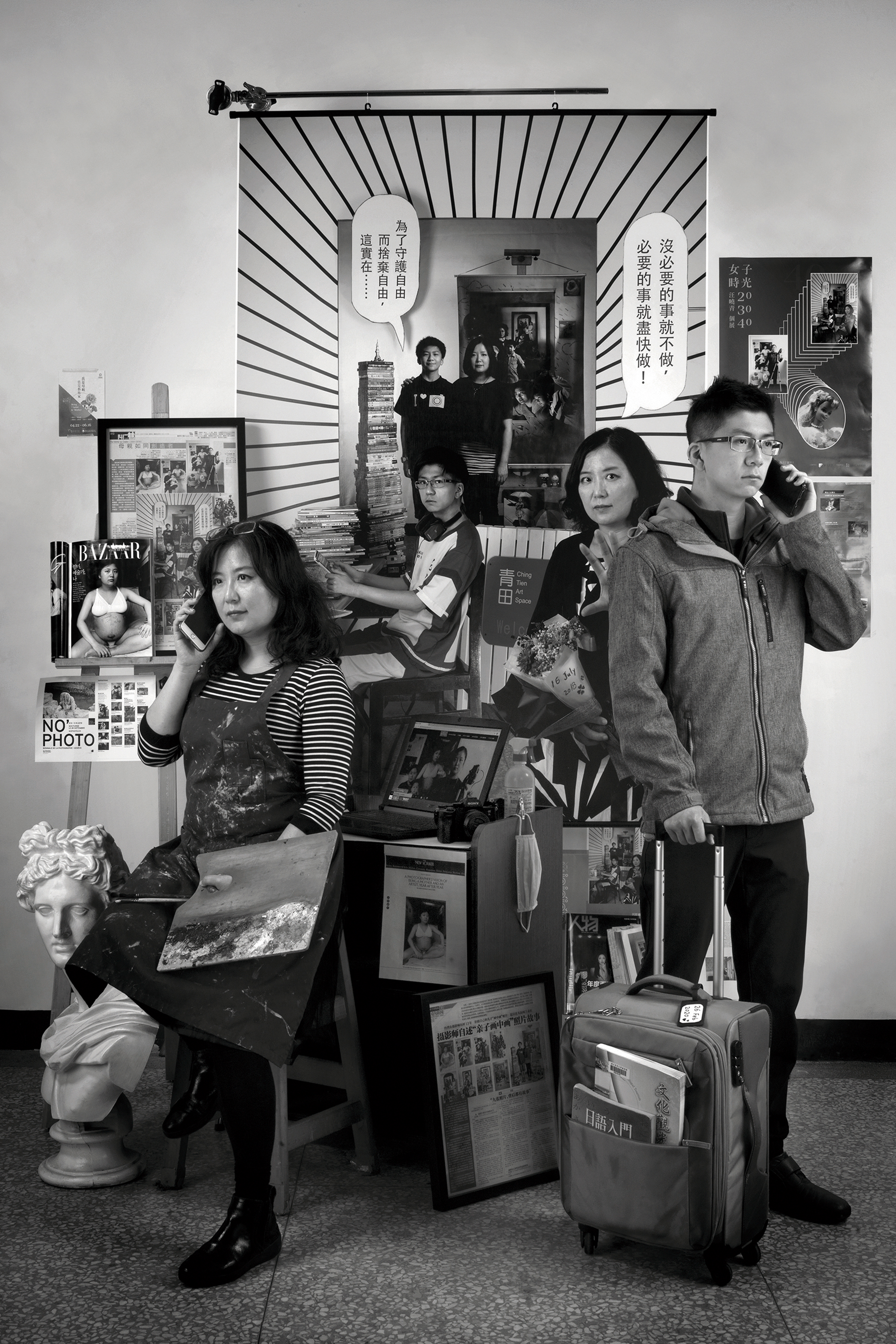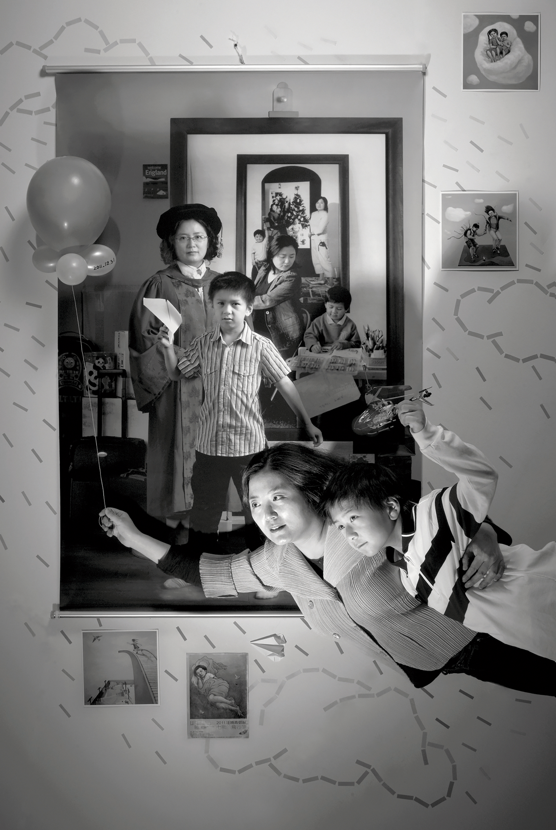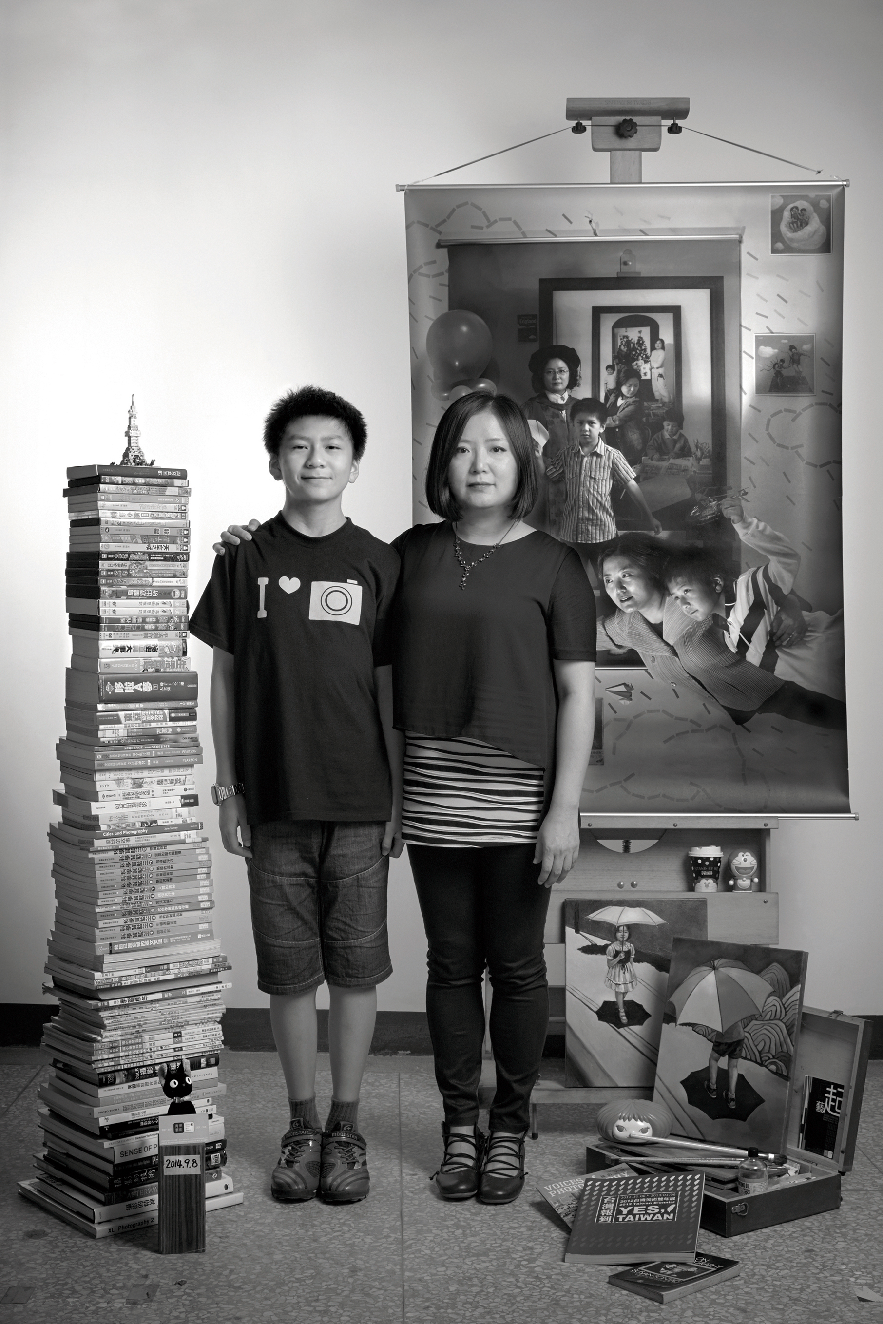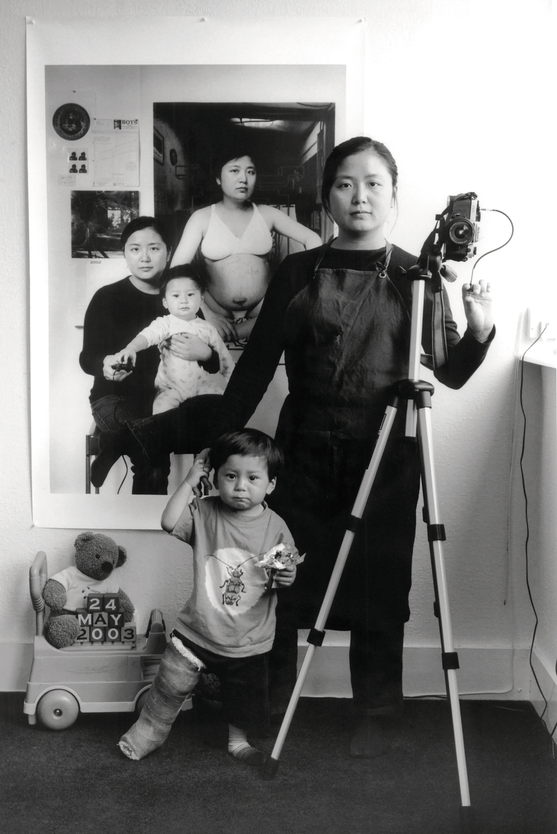The first photograph in The Mother As a Creator series is a self-portrait taken in 2001, on the day before I was due to give birth. The rest of the photographs were taken in subsequent years whenever my son and I had experienced something memorable together. Each of these shows the two of us in front of the photograph that precedes it in the series. So with the passage of time, various versions of us—at different stages of life, with different looks—are gathered into each new photograph. Different images of us from various temporal contexts—in settings co-created by ourselves—are squeezed into a curious space. They engage in dialogues with each other and furnish a complex, detailed, and vibrant record of our lives.