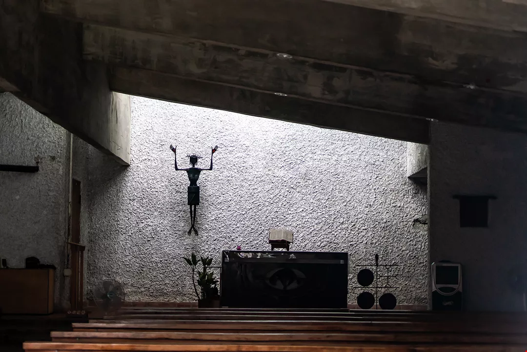 The chapel is situated in an enclosed space on the top floor. Natural light is filtered through a skylight above the altar and through apertures below the pitched roof, complementing the luminosity of the stained-glass windows depicting the Stations of the Cross in the wall to the right of the pews. When the sun shines through the stained glass, projecting multicolored patches of light upon the wooden seats, the chapel becomes utterly enchanting.