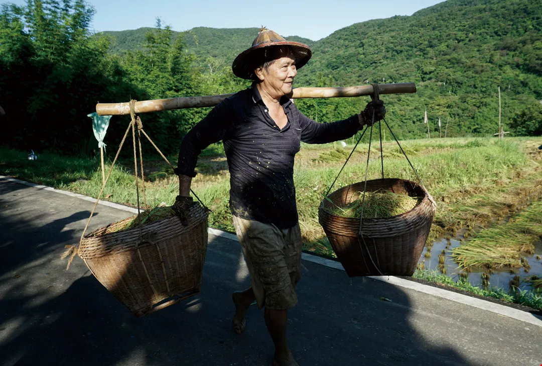 Jian Qiuyang carries freshly harvested rice from his fields to the road in front of his house, where it will be dried in the sun.