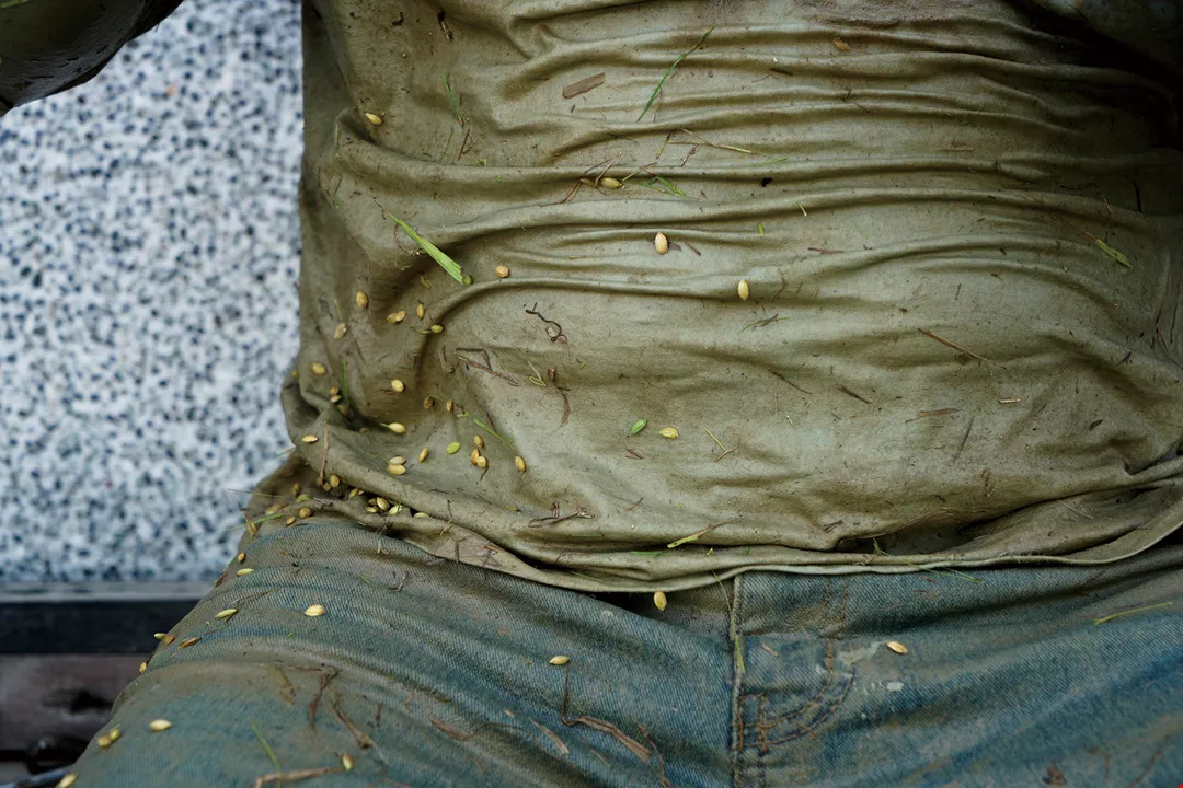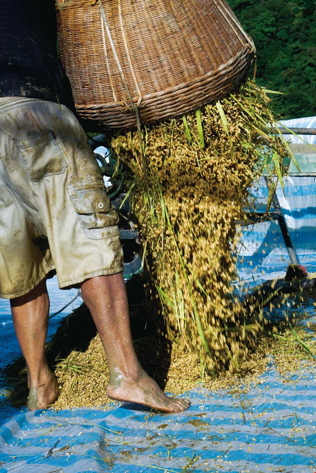 Farmers helping out with the harvest lay the heads of whole sheaves of rice into the hulling machine. Because the rice is grown in wet paddies, the screen on the hulling machine is covered in water droplets.