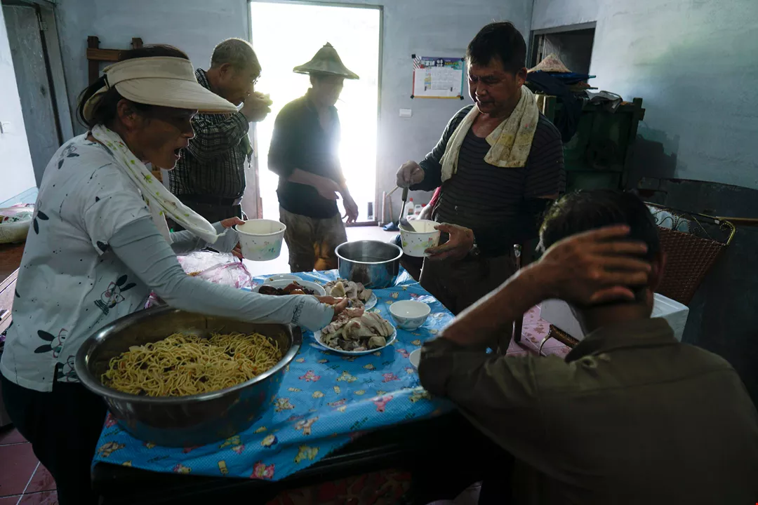 Reaping rice by hand requires a lot of manpower and is exhausting work, so eating the “rice harvesting meals” is an important part of a day of harvesting. Besides the three main meals of the day, there are two snacks, one in the morning and one in the afternoon. Only by consuming a lot of food can the harvesters replenish the vast amount of energy expended, which is why there is the tradition of eating five meals a day when harvesting rice. Jian Qiuyang’s younger sister, a very experienced old lady, has already picked a big pile of water spinach (Ipomoea aquatica) and sweet potato leaves before heading up the mountain. She and her neighbor, another old lady, use the time before things get busy to sort through the vegetables and clean them ready for cooking. Then Jian’s sister sets to work in the kitchen preparing the snack to be eaten at 10 a.m.: she cooks up stir-fried noodles, pork knuckles with braised egg, boiled chicken, and fish soup made with freshly caught fish. After the meal there is even chilled grass jelly and homegrown watermelon. Jian brings out the finest foods in his house to express his gratitude to the farmers who have come up to help him by offering them excellent rice harvesting meals. The old rural tradition of eating five meals a day when harvesting rice has been preserved thanks to the continuing practice of labor sharing in Gongliao.