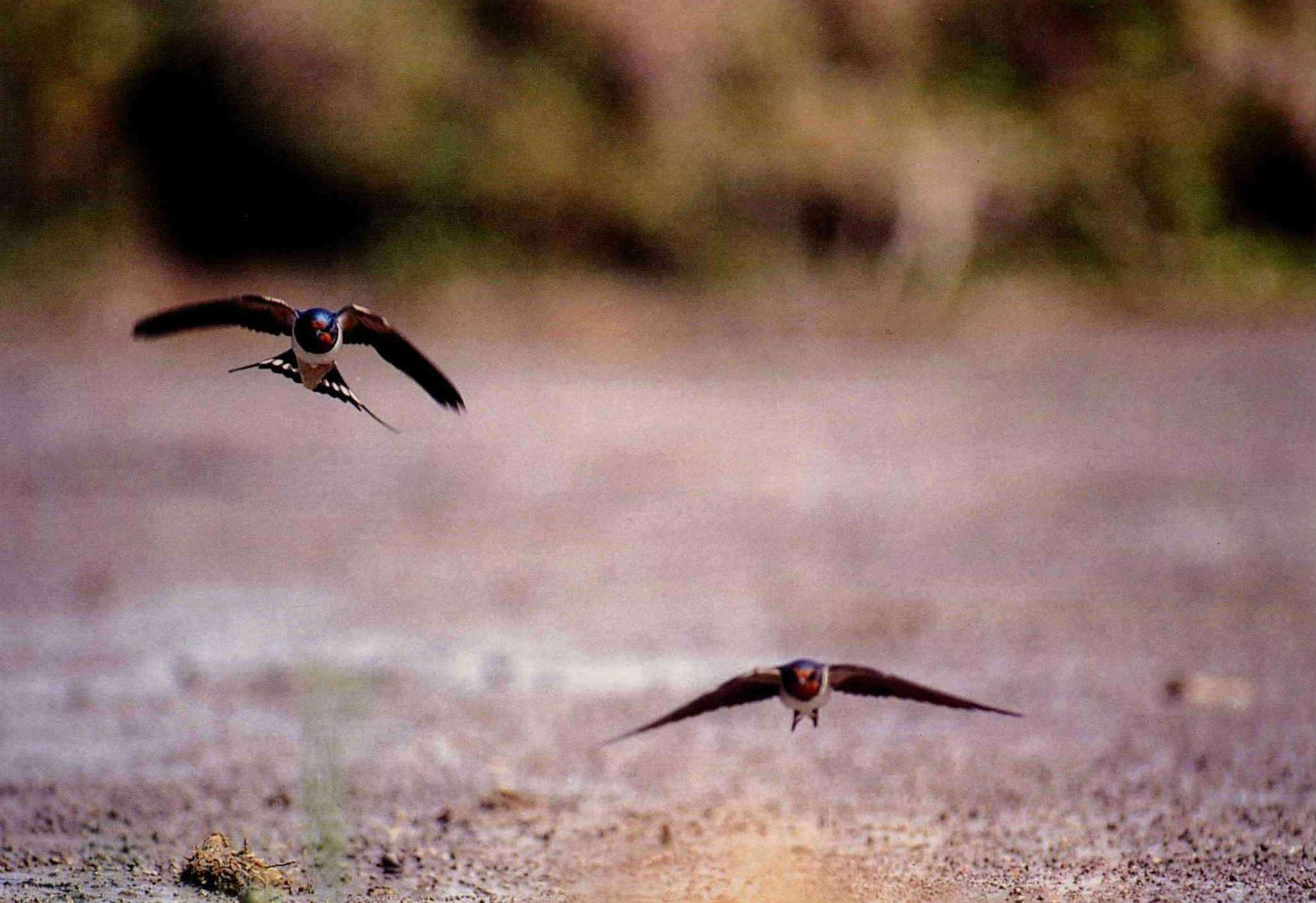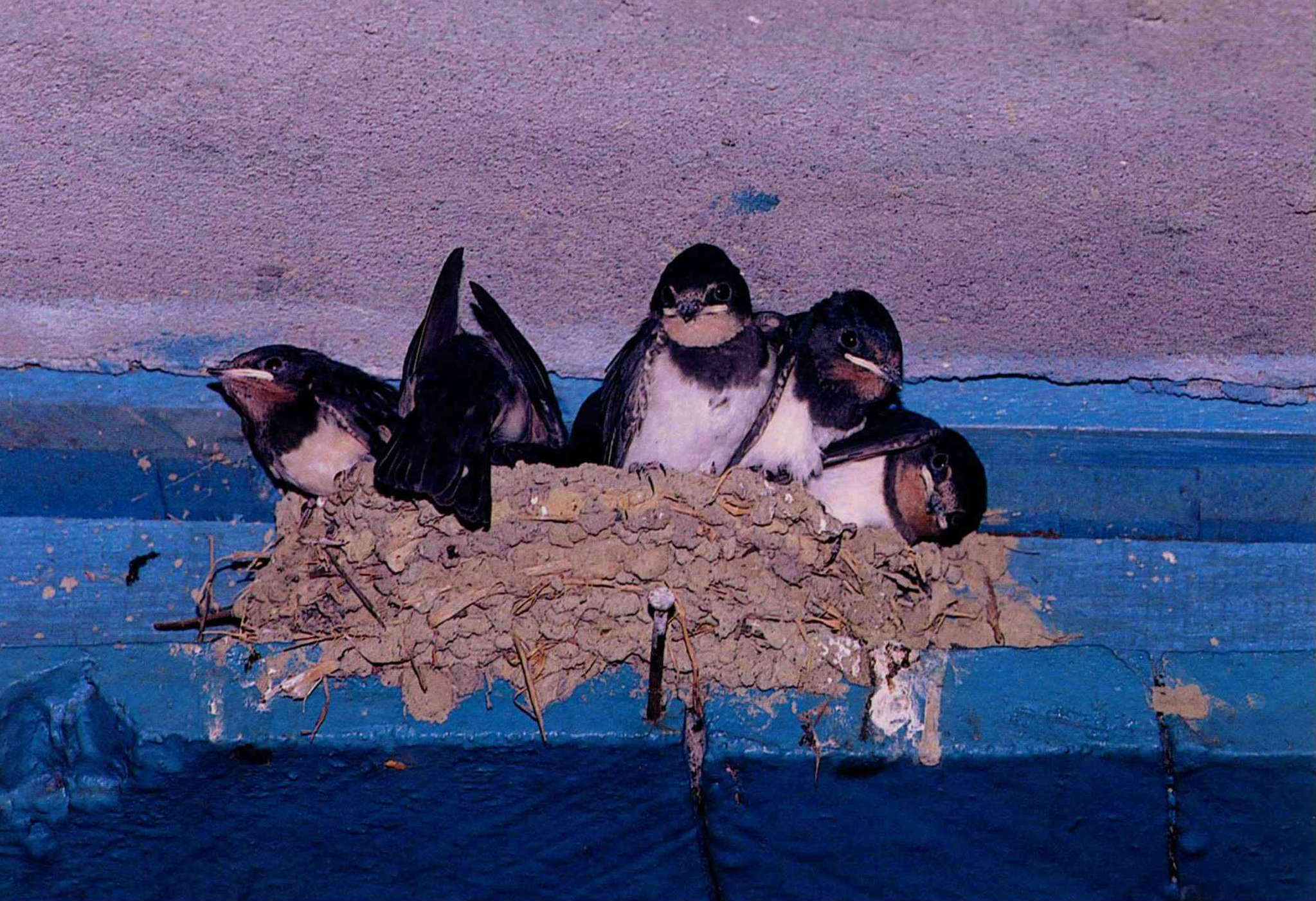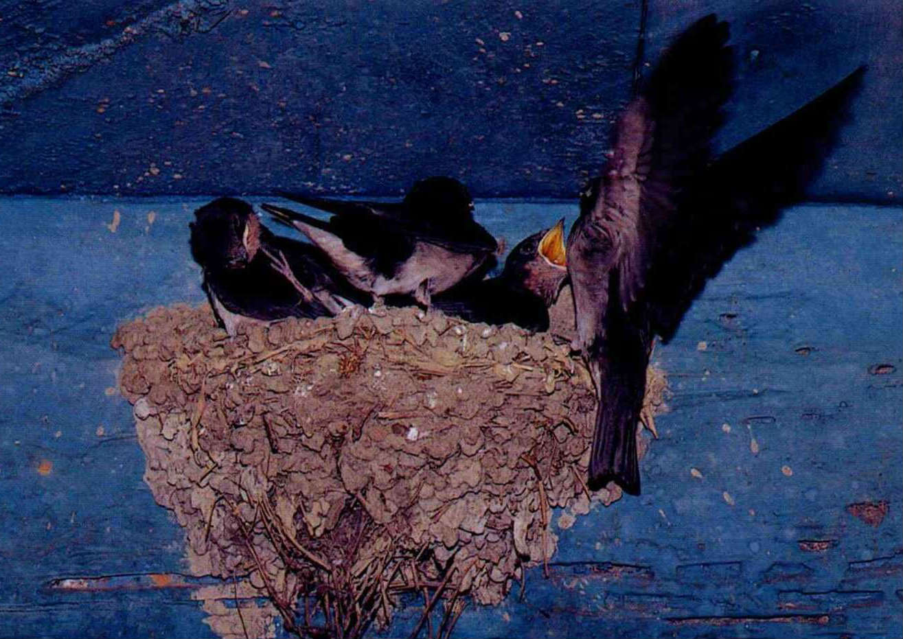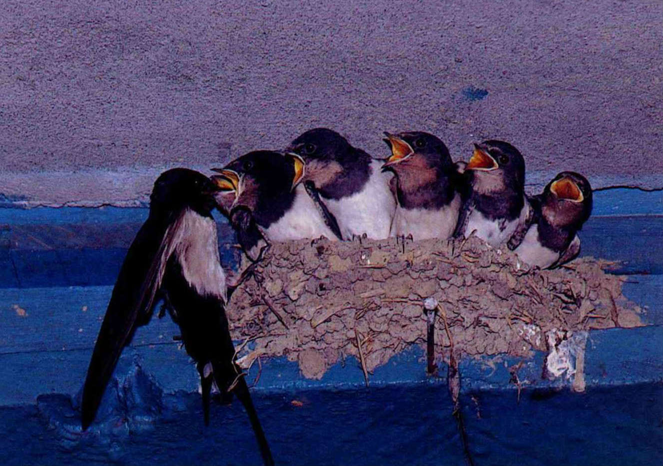 In early March, when the barn swallows fly south, they gradually install themselves in this little mountain town. Walking through the narrow streets, you have be careful of the swallows darting this way and that as they anxiously search for suitable places to build their nests. At this time they also begin to appear on stream banks and in paddy fields which are not too deeply flooded, shuttling back and forth to scoop up mud or fetch straw. Males and females alike never return to their nests empty-beaked-they always carry back some wet mud or a piece of straw. They throw themselves into the work of nest building with all their energy. Once they are done, they lay their eggs, and incubate them. When it is time to feed the newly hatched chicks, the adult birds are busier than ever. Faced with five, six or even seven gaping beaks, it is a wonder the parents do not drop from exhaustion. The amazing rate at which they feed the chicks is a testament to the travails of parenthood. After ten to 14 days, the chicks are fledged and leave the nest. Then the adult birds get ready to raise another brood, and if the season is long enough, even a third.