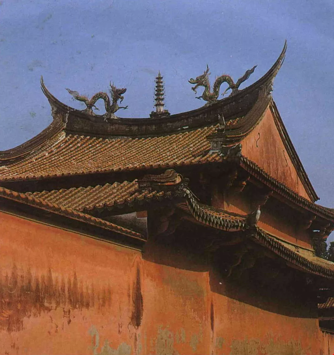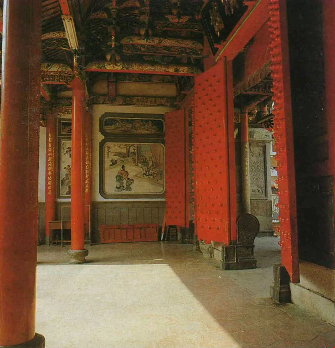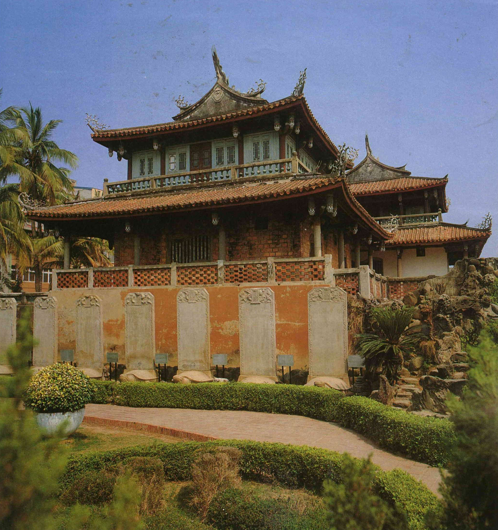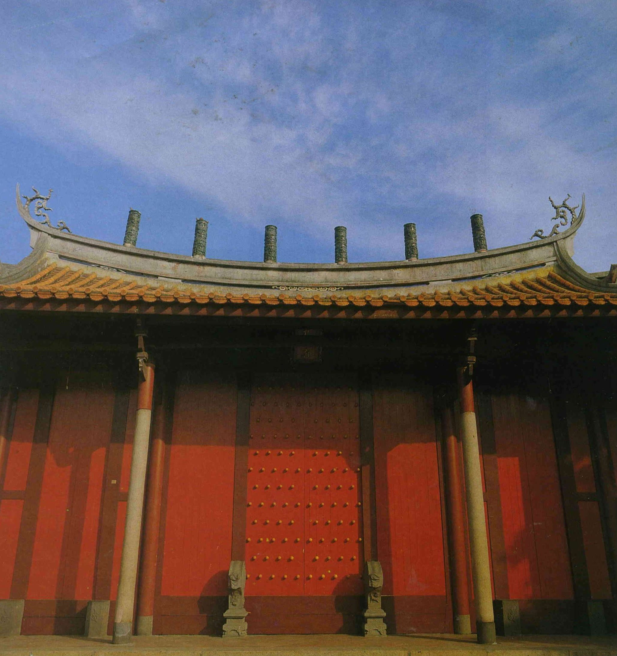 The Ling-hsing Gate of the Confucius Temple, Changhua, is surmounted by three pairs of funnels "communicating with heaven." The main Hall of the Sage is a most distinguished palatial building surround ed by a raised verandah.