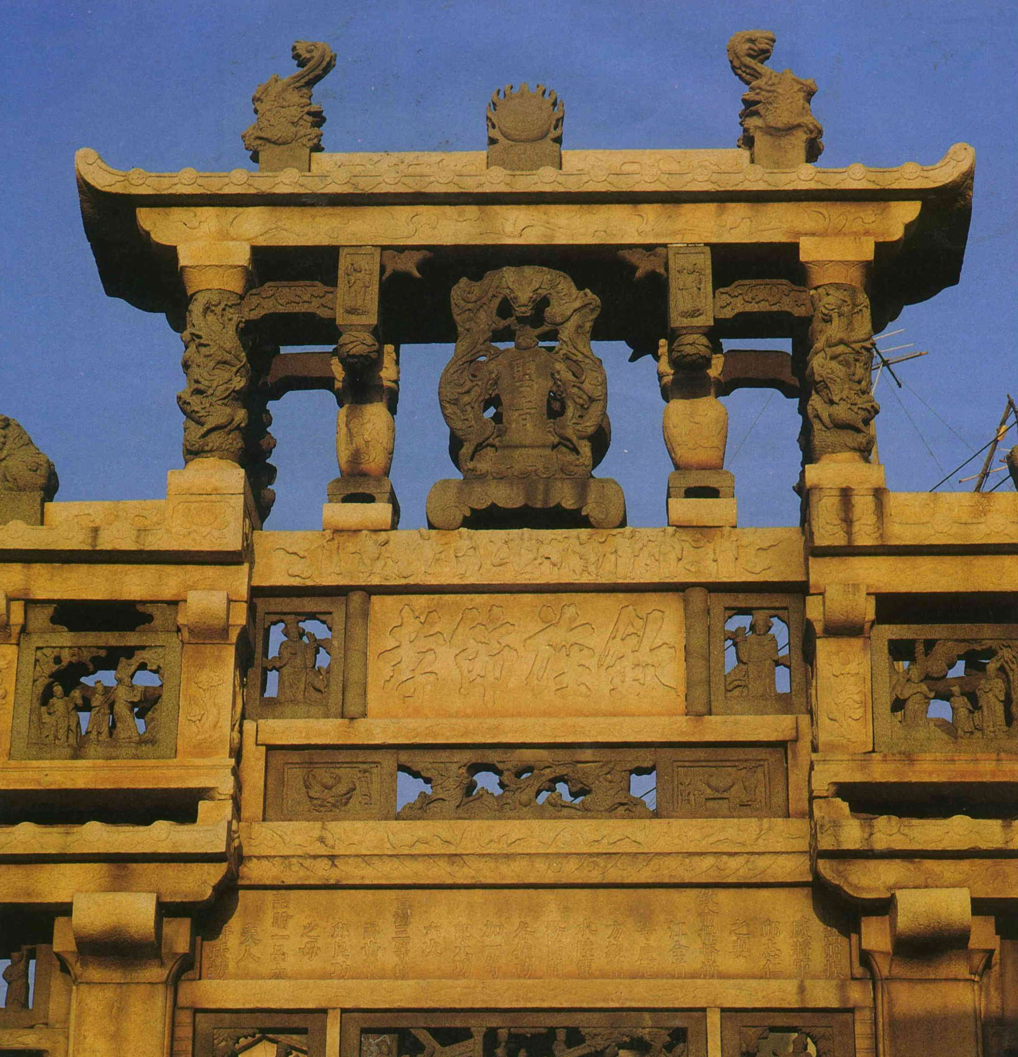 The monumental stone gate in honor of General Chiu Liang-kung's mother, Kinmen, was erected in the Cha-ch'ing reign (1796-1820) of the Ch'ing dynasty and bears an inscription authorized by the emperor.