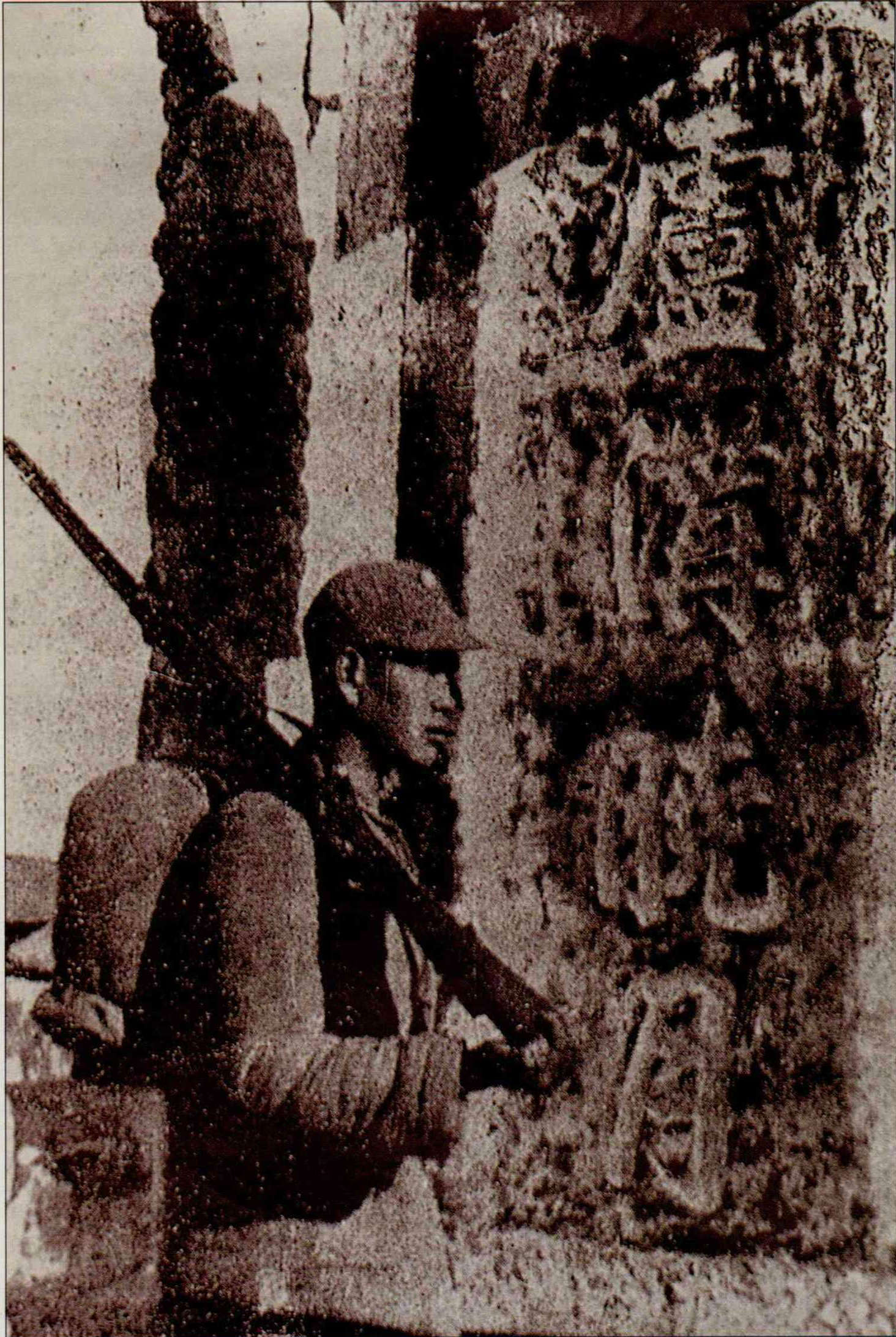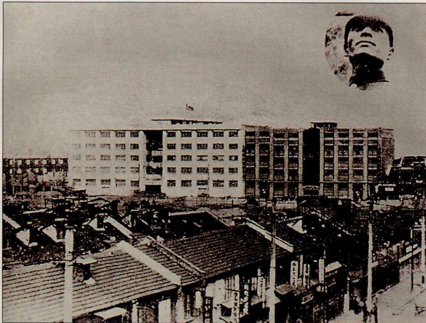 Full-scale fighting began in East China earlier than in North China. Aft er the September 18 Incident (in Manchuria in 1931), and the January 28 Incident (near Shanghai) the following year, Japanese forces launched attacks around Shanghai, paving the way for an all-out battle f or the city later on. Shanghai fell in October of 1937. Eight hundred men led by Hsieh Chin-yuan were ordered to hold the Sihang warehouses at Xiabei to cover the retreat of the Chinese army. On September 28 occurred the nowfamous story of how girl scout Yang Huei-min braved death to swim across the river to deliver a national flag to inspire the isolated soldiers. The photo shows the ware houses; Hsieh is in the inset at the upper right.