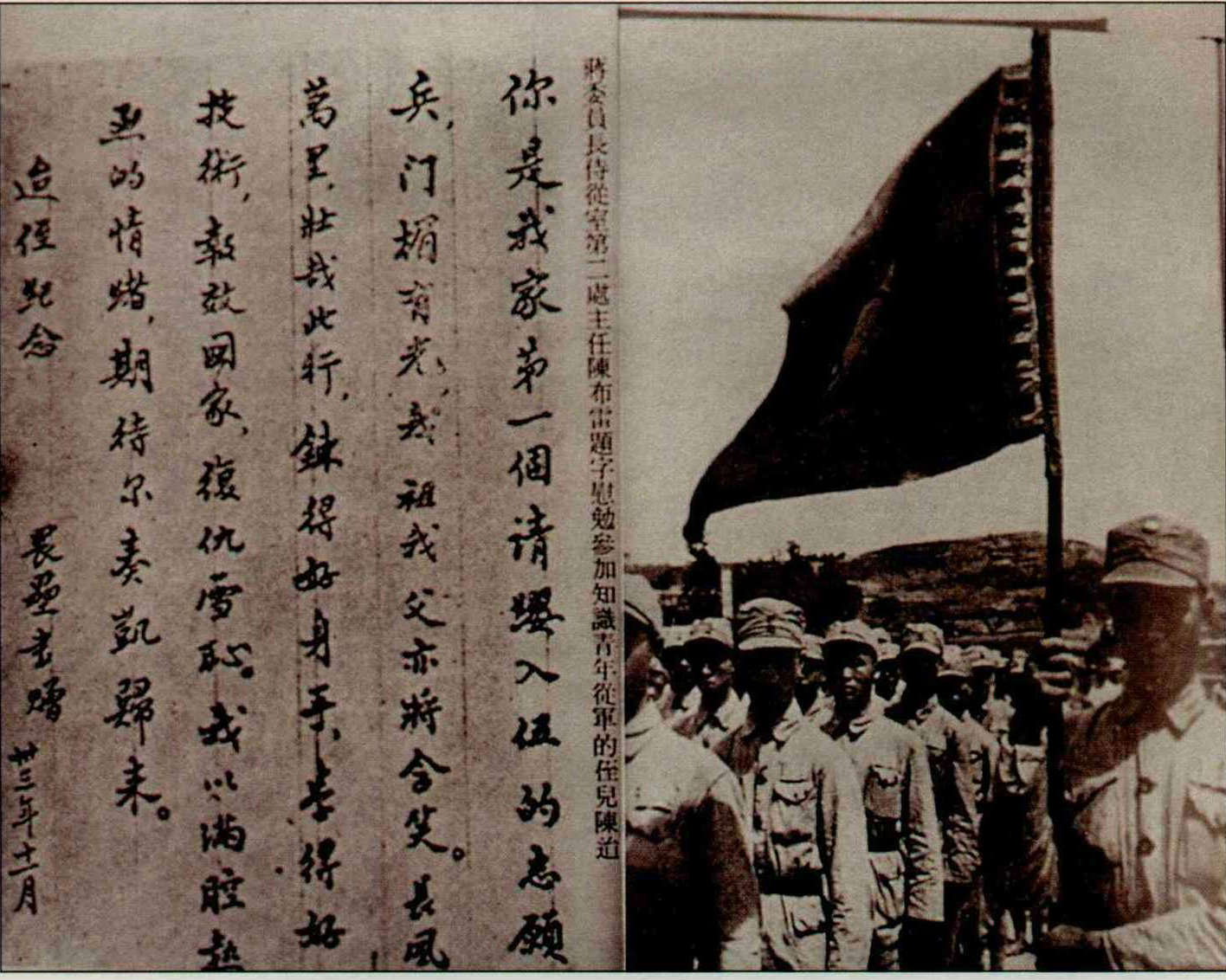 China was materially bereft during the war, and military equipment was n ot up-to-date. But morale was high, and even students, supported by their families, gave up their pens for swords. The photo shows a letter by Chen Pu-lei, an early member of the Revolutionary Part y (precursor to the KMT) and chief aide to Generalissimo Chiang Kai-shek, to his nephew.