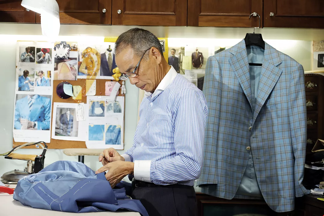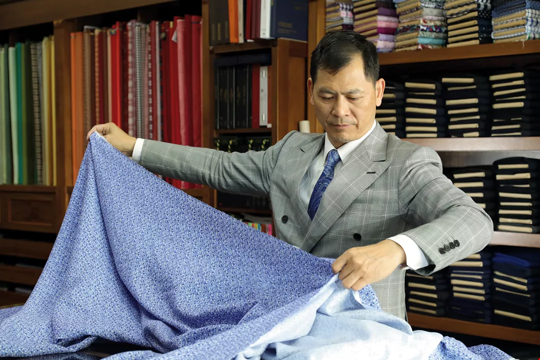 Fan moved from Miaoli to Taipei when he was 16 to work as an apprentice, and he has been involved in the wholesale fabric trade for 38 years now. He experienced the boom era for tailored uniforms, when consumers would line up to choose their fabric and get measured. He then witnessed the damage that branded ready-to-wear clothing caused the made-to-measure sector. Yet Fan remained determined and adopted a more entrepreneurial approach, buying Kaien Bespoke Tailoring. The decision bore witness to his confidence in the market for tailored clothes if only the proper approach were taken.