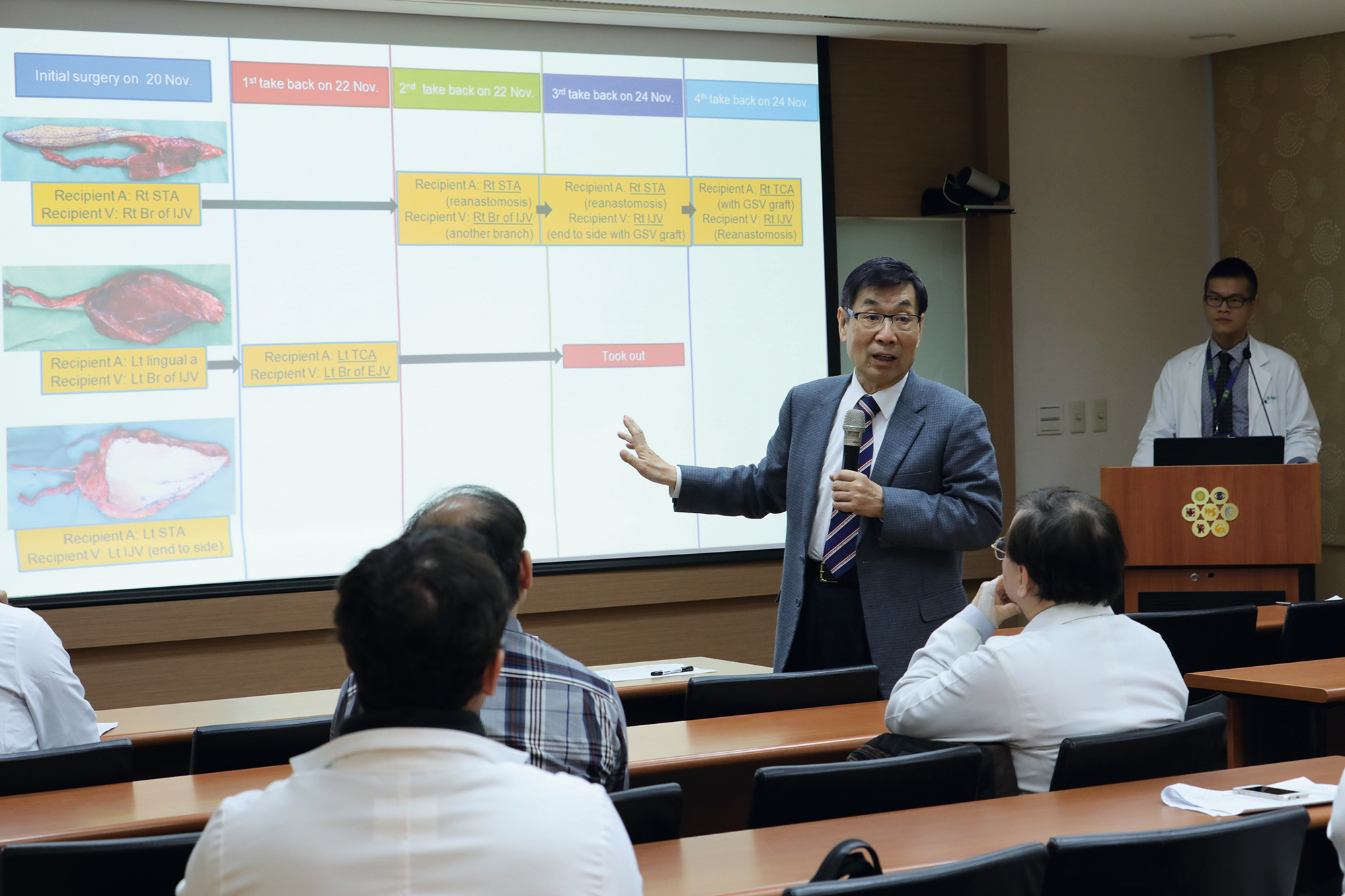 During “morning meetings” in the Plastic Surgery Department at Chang Gung Memorial Hospital, some research fellows present reports on their work, while professors make on-the-spot explanations.