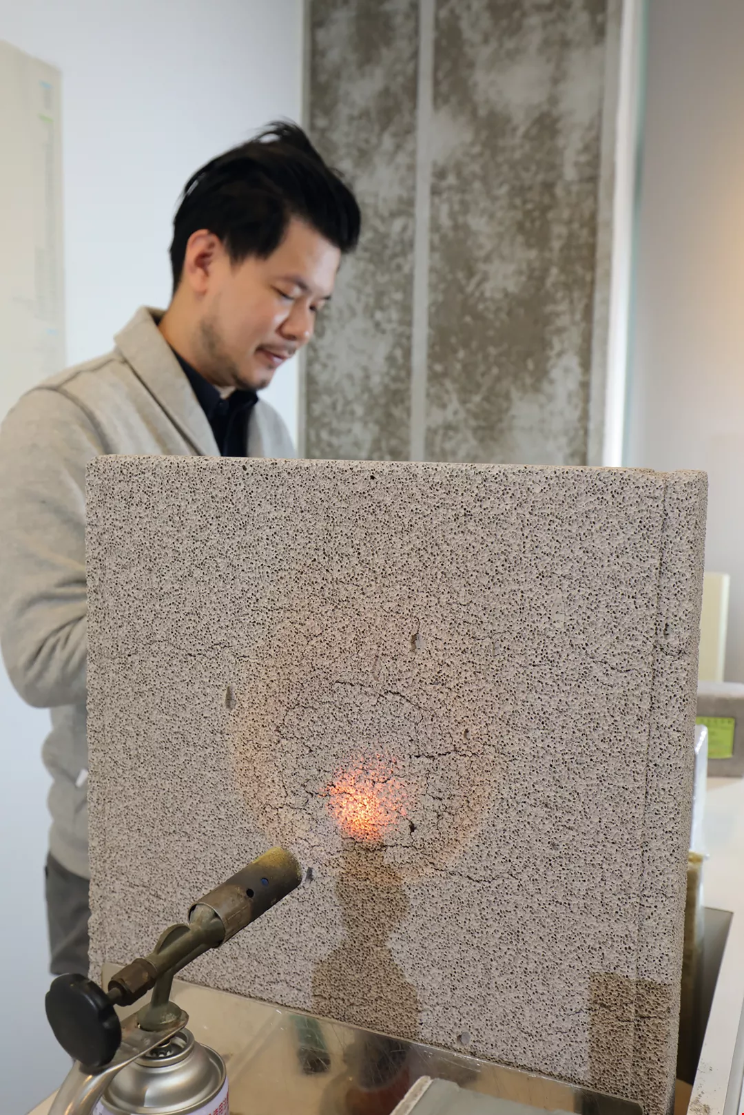 Opening up the valve of a blowtorch, T.A. Wu, executive assistant to the chairman of Spring Pool Glass, directs a blue flame of 800 °C toward a “green” building material the company has newly developed, the AH Lightweight Insulation Block. Even after applying the fire to the block for several minutes, there is no smoke whatsoever, and no burn marks on the surface. Moreover, the other side of the block is still cool to the touch. The material’s fire resistance and thermal insulation properties are amazing.