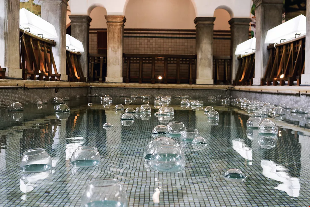 Glass bells floating in a hot-spring pool make a bright sound when they strike each other, allowing people to enjoy the feeling of a summer’s day with both their auditory and visual senses. (photo by Rock Burger Photography, courtesy of BIAS Architects)