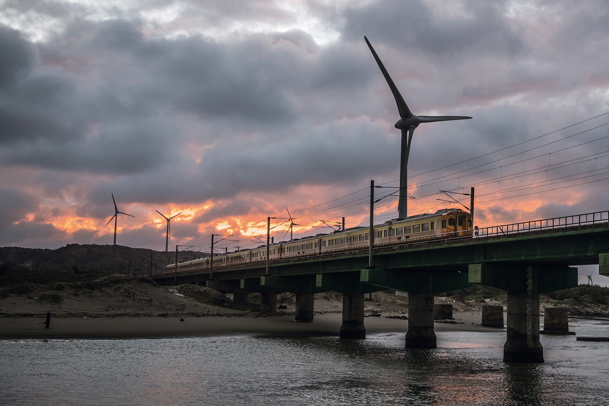 We continue our journey along Provincial Highway 61. Rail fans have told us of two can’t-miss sights for photography along this route. At the highway’s 106.3 kilometer mark, a side road leads down to the mouth of the Xihu River. From there you can get a shot of wind turbines, trains, and ocean waves together in one frame, and when evening comes you can add the setting sun into the picture.
