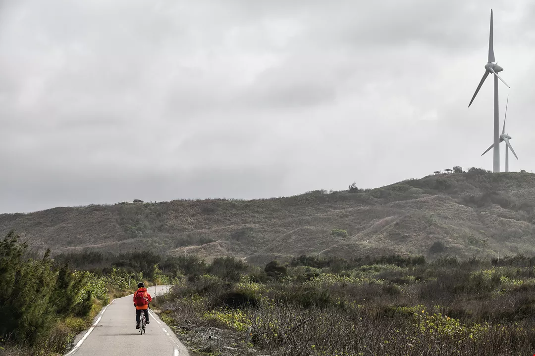 To reach the next scenic spot, we have to work hard riding up Miaoli County Road 33 to the commanding height of Haowangjiao, from where you can see the deep blue Taiwan Strait in the distance, the gigantic wind turbines along the coast, and a panoramic view of the coastline. In the strong wind, we wait for a train to come coursing through the verdant land, so that we can capture its image. Only then do we contentedly pack up our cameras.