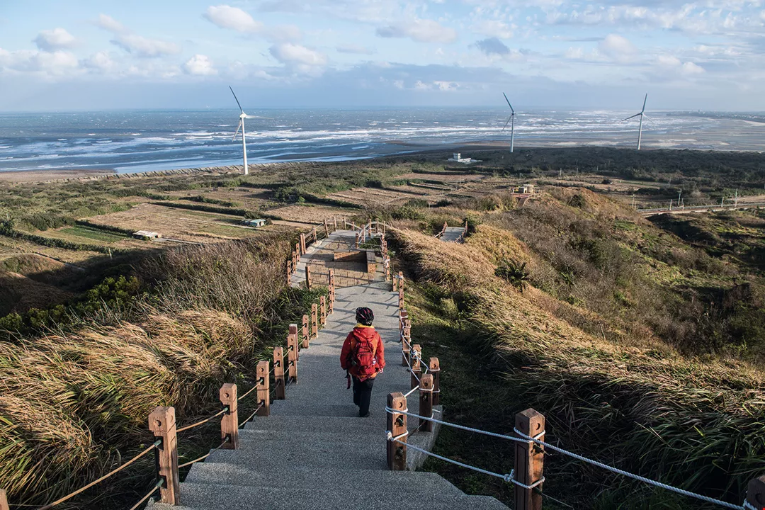 Gazing out from Haowangjiao, farms, wind turbines, and the Taiwan Strait are all visible, along with the occasional sight of a train coursing through the greenery.