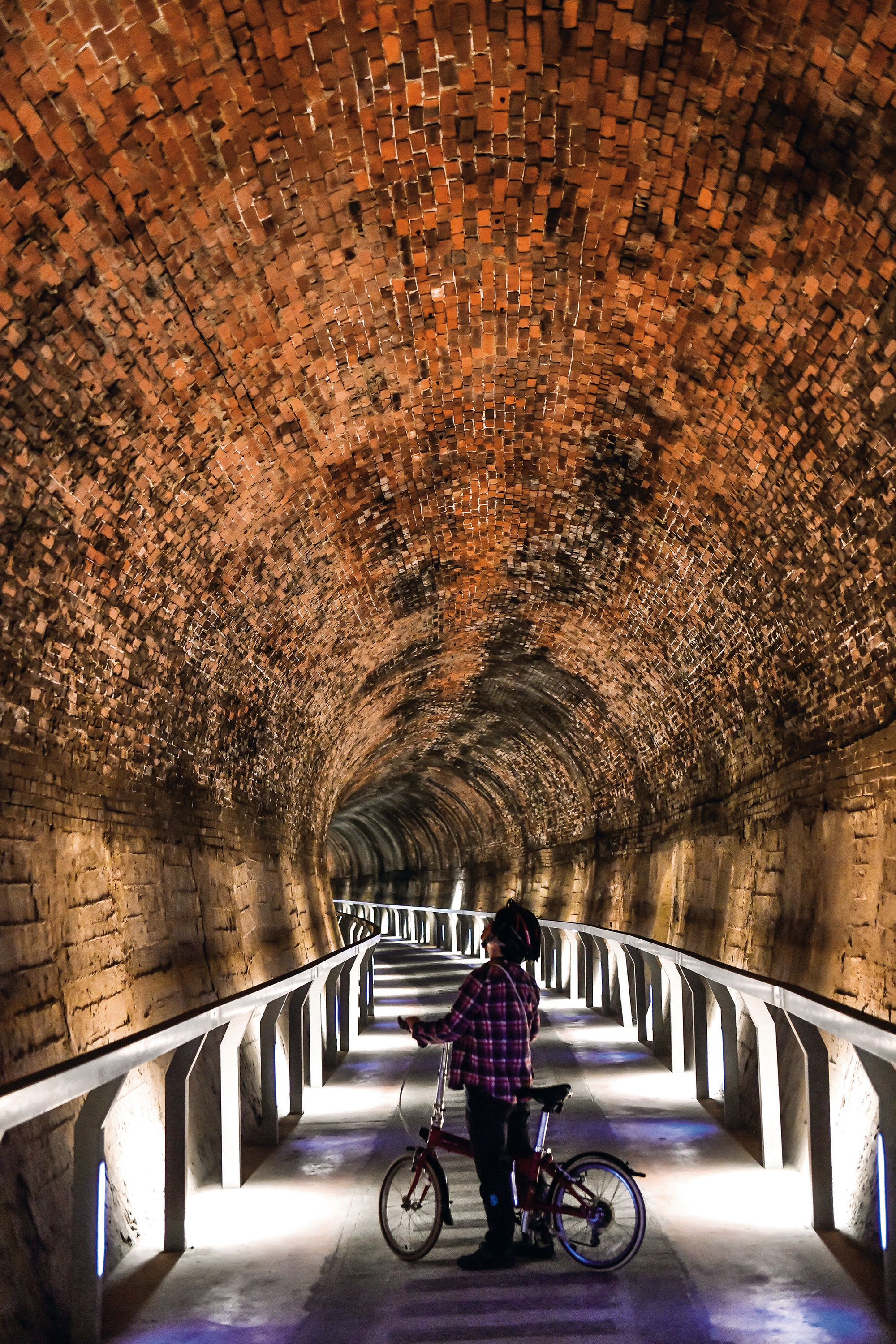 Another sight worth exploring is the nearby Old Guogang Tunnel—in fact a sequence of three tunnels. When the West Coast line was electrified in the 1970s, its route was altered to avoid the tunnels, which were abandoned. Today the old route, complete with the beautiful horseshoe-shaped brick-lined tunnels, has been transformed into a bicycle trail with colorful lighting.