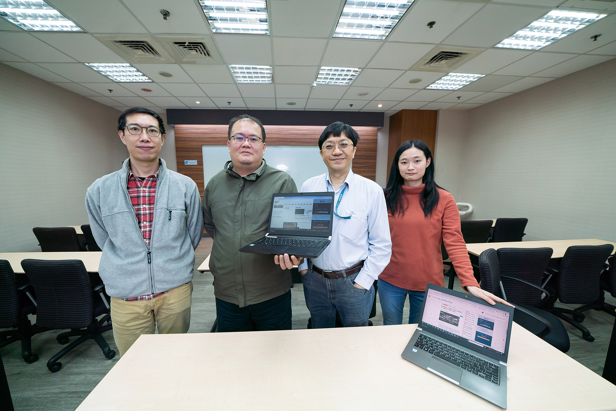 Teams led by Chen Ping-i (second from left) of the Digital Service Innovation Institute and Chang Wen-tsung (second from right) of the Cybersecurity Technology Institute have developed AI-based technologies to accelerate fact checking work. (photo by Lin Min-hsuan)