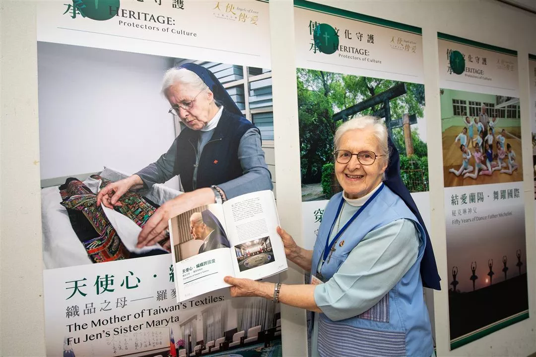 One of the articles collected in Angels of Love describes the contributions to Taiwan’s textile industry of Sister Maryta Laumann, founder of the Department of Textiles and Clothing at FJCU. This photo shows Sister Maryta holding a copy of the book.