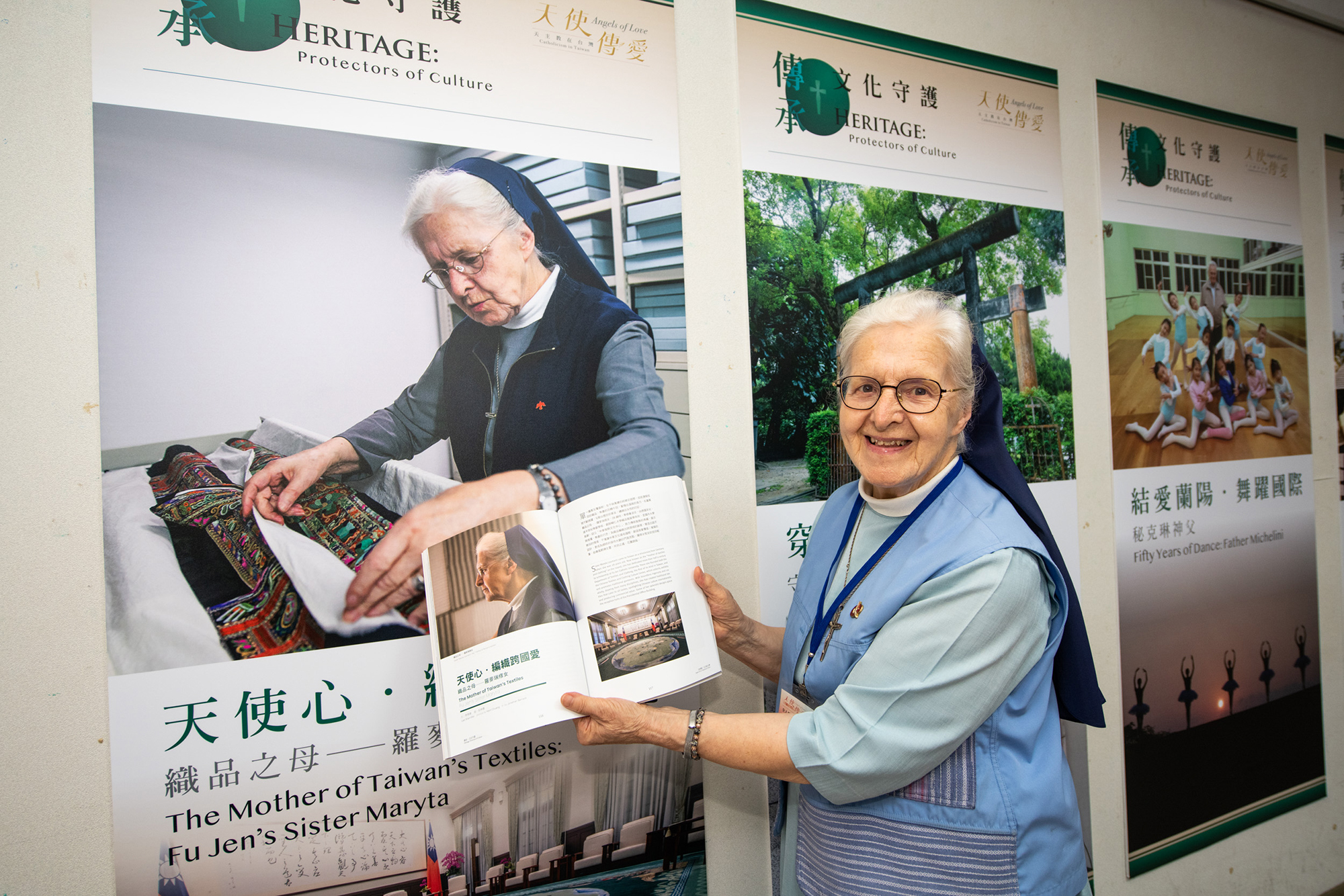 One of the articles collected in Angels of Love describes the contributions to Taiwan’s textile industry of Sister Maryta Laumann, founder of the Department of Textiles and Clothing at FJCU. This photo shows Sister Maryta holding a copy of the book.