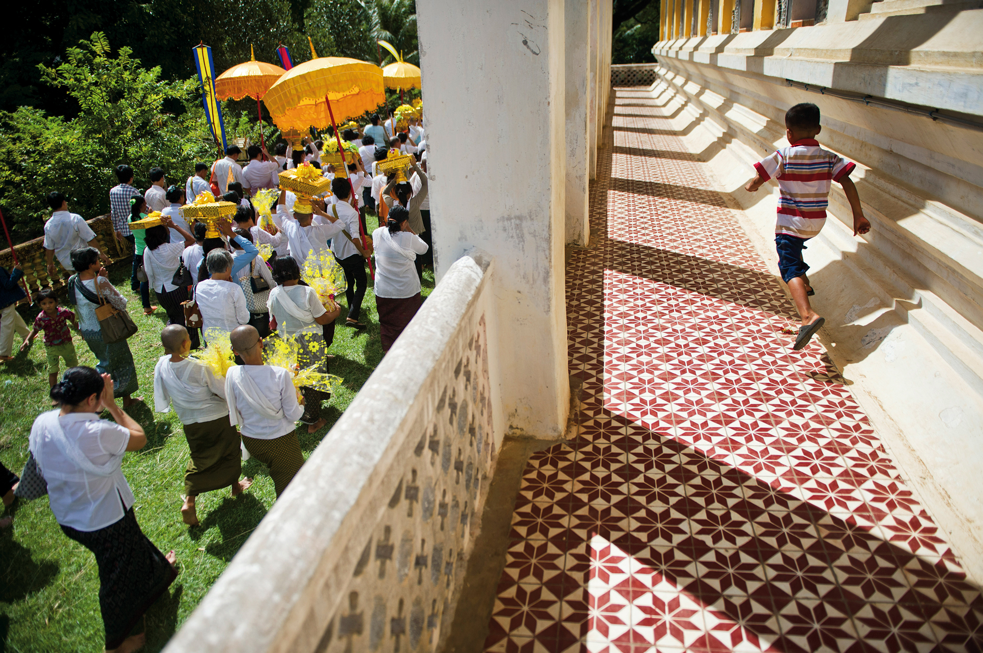 During the festival, Cambodians prepare homemade glutinous rice balls, cakes, fruits, candles and other offerings for the spirits of the deceased, then, led by monks, carry them around the temple on small plates to distribute them to the spirits.