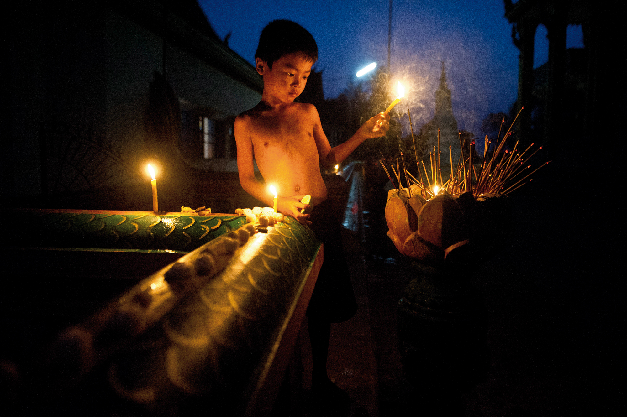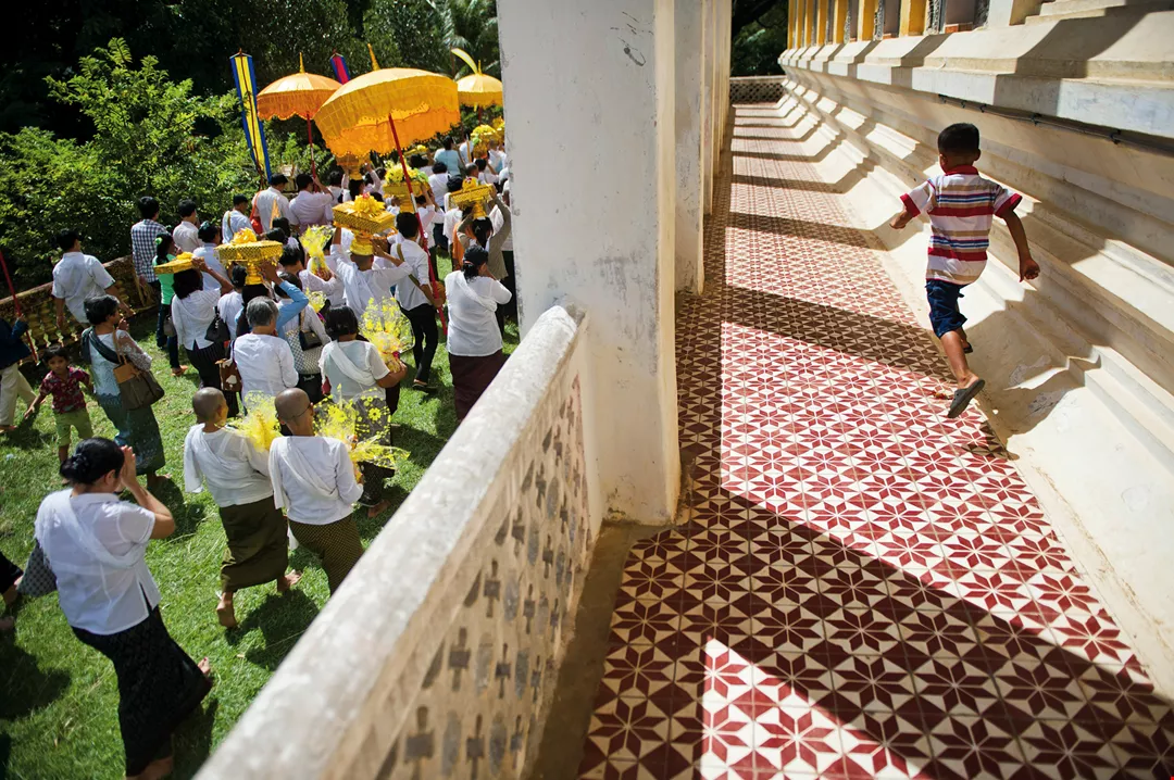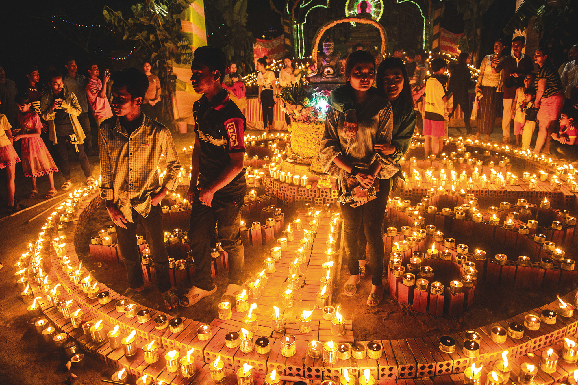 Meak Bochea Day: Meak Bochea occurs on the full moon of the third month of the Buddhist calendar, and its ceremonies are usually held in temples at night. In the photo, lay people stand in a mandala made of candles to find peace.