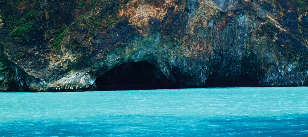 The volcanic cliffs on the southern side of Guishan Island have been eroded by the sea, forming caves that look like eyeglasses. The caves, with their stalactites and stalagmites, are one of the island’s “eight wonders.”