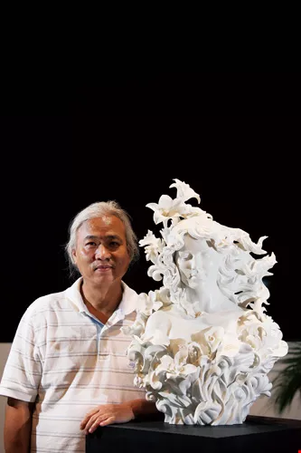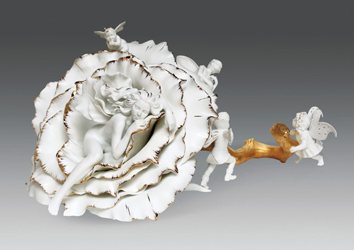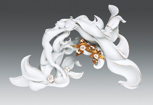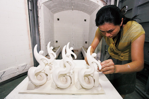 (facing page) Taiwanese contemporary ceramicist Henry Shen is the creator of his own brand, 1300 Only Porcelain. In September 2010, he introduced a new line of products, "720 Degrees: Three-Dimensional Sculpture in the Round," reintroducing Taiwanese ceramics to the international community. The picture shows the work Spring from the Venus Dream Series, consisting of 70 separate pieces created in more than 400 molds. Six craftsmen took a week to assemble the parts into the final design, which was then fired in a kiln. Success ran at only 20% in the initial stages.