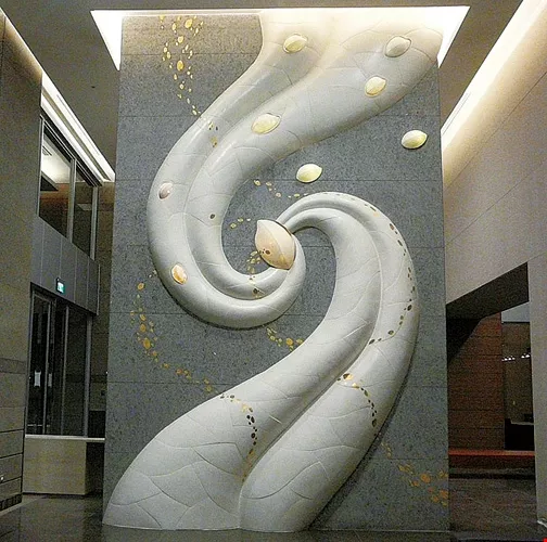 Breeding, a two-story high ceramic mural, is based on the qualities of the Chinese staple food, rice, symbolizing not only harvest and rebirth, buat also the nurturing of present and future life.