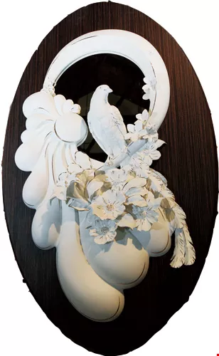 "Kaolin, or china clay, is a silicon-alumina compound. The silica expands by around 6% as a porcelain body is fired in a kiln, but when the temperature reaches 550-600°C, it contracts by 15%. So the tensions created by this expansion and shrinkage amount to a total resulting from a 21% change." As an example, a fine porcelain wall-hanging, Formosan Blue Magpie, with a 3D relief structure, was designed with a height of 110 centimeters, but contracted to around 90 cm after firing.