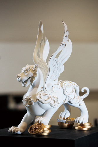 The work Ru Hu Tian Yi from the Auspicious Oriental Animals series shows a new stylized animal.