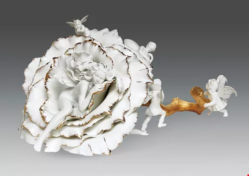 The most challenging work for the team has been Spring from the "Venus Dream" series. This large vitreous white porcelain bust represents Venus' expression as she wakes in early spring with flowers blooming all around. The work actually consists of 70 separate pieces which were made in more than 400 molds. After the parts were completed, six craftsmen took a week to assemble the parts to form the body. After the formed body had fully dried, it was ready to fire. Because Venus' hair was so wavy and the flower buds so small and delicate, there was fear that during the firing process any part unable to bear the heat might shatter or deform, thereby leading to the destruction of three months' effort. Success ran at only 20% in the initial stages.
