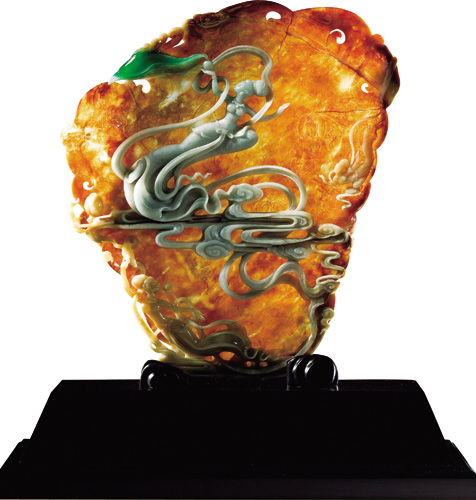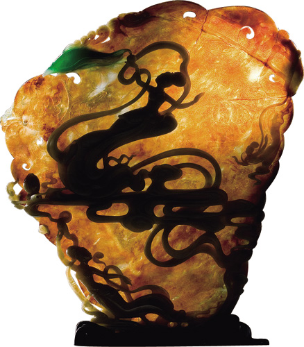 Dance of the Phoenix, 31 x 25.3 x 2.5 cm, 2009 Nephrite comes in just one color, while jadeite is multi-colored. In crafting this piece, the artist has taken advantage of the many colors in the jadeite to create multi-layered images of spectacular beauty.