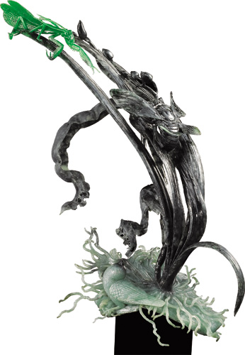 Eyes on the Prize, 23 x 24 x 15 cm, 2006An imperial green praying mantis sits on an orchid leaf, wings retracted, pincers poised and ready to make a meal of a nearby black cicada. But little does the mantis know that a bird behind is thinking the mantis itself would be a tasty treat. A life-and-death drama is set to unfold!