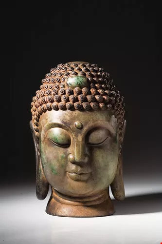 Eternity in an Instant, 30 x 20 x 18 cm, 2009 Pictured here is a Buddha head that forms part of a larger work that also includes two bodhisattvas. Painstakingly executed coils of hair and closed eyes re-create the beauty of Song-Dynasty carvings, and give expression to the artist's deep religious sentiment.